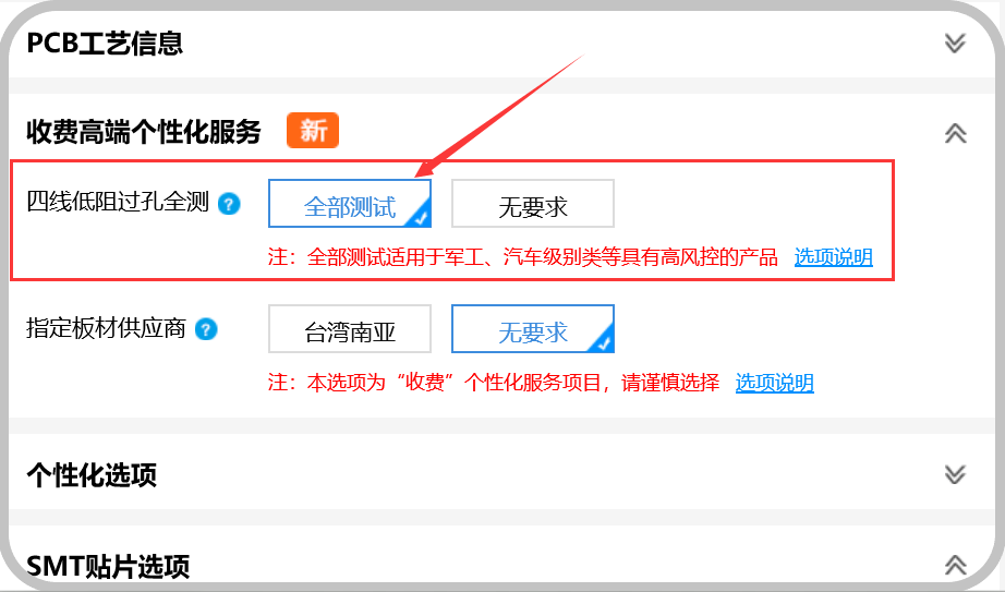 嘉立創(chuàng)在提供了四線低批量性管控的同時,也提供了客戶的全部進行低阻測試的高端選項,