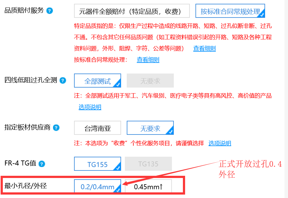 5:2019年9月1號(hào) 嘉立創(chuàng)又邁出重要的一步,正式開放高難度加工工藝:0.4的過孔外徑,0.2的內(nèi)徑 加工工藝參數(shù)開放,又給大家了一個(gè)新的選擇
