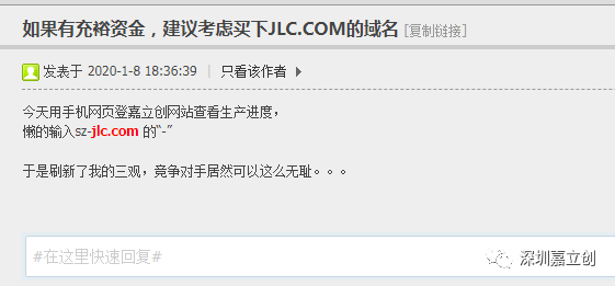若干年后:XXX同行公司高管,盯著嘉立創(chuàng),在海外購買了WWW.SZJLC.COM的域名。當(dāng)客戶要訪問深圳嘉立創(chuàng)官網(wǎng)域名:WWW.SZ-JLC,少輸個“-”時,結(jié)果直接設(shè)置跳轉(zhuǎn)到XXX同行網(wǎng)站,再度來一個李鬼與李魁的故事,我方人員在曉明利害關(guān)系私下從xxx同行買下這域名,XXX同行還以此事為自己美化,就像做了壞事,然后賠理道謙了還理直氣壯!