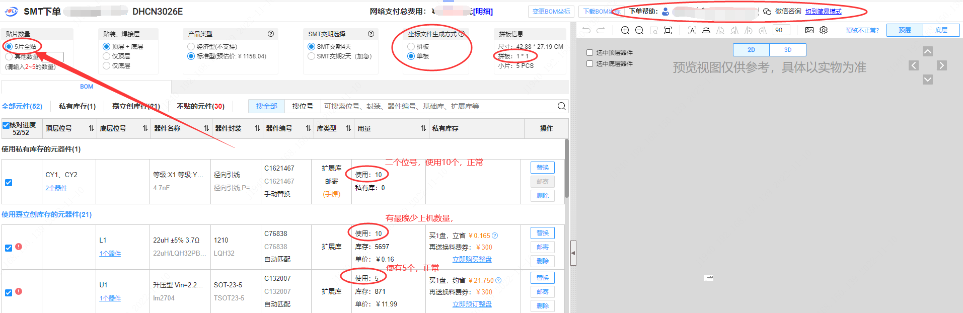 拼板: 如【坐標(biāo)文件生產(chǎn)方式】選對了,刷新后使用數(shù)量還是錯(cuò)的,注意【拼板】是否對,如【拼板】后面的拼板方式與PCB實(shí)際拼板方式不符。 請聯(lián)系匹配界面右上角的【下單幫助】人員