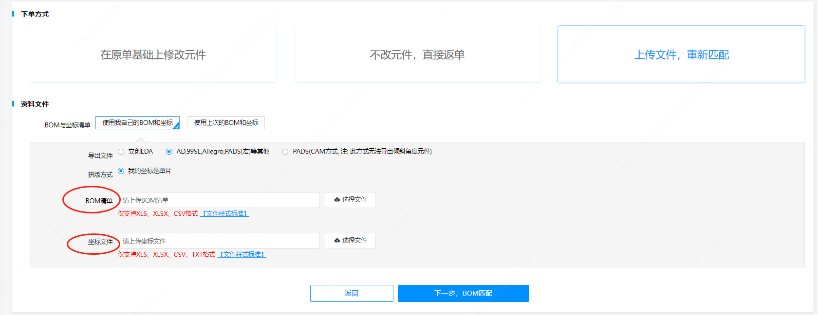 選此方式下單,需要上傳新的BOM和坐標文件,點擊“下一步BOM匹配”后,會進入BOM匹配界面,您選擇您需要的器件即可,后按流程操作即可成功下smt訂單,此時SMT為新單。
