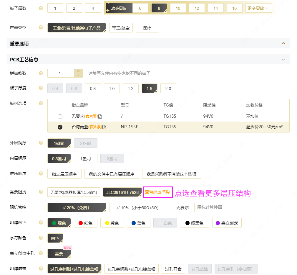 目前系統(tǒng)已開通4-32層的多層板制作,更多的層壓結(jié)構(gòu)請(qǐng)?jiān)谙到y(tǒng)中查看: