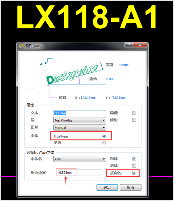 二. 雙擊已經(jīng)放置好的文本更改屬性(或在放置的狀態(tài)下按Tab鍵修改屬性),如下圖所示進(jìn)行更改,即可完成鏤空字體的放置。