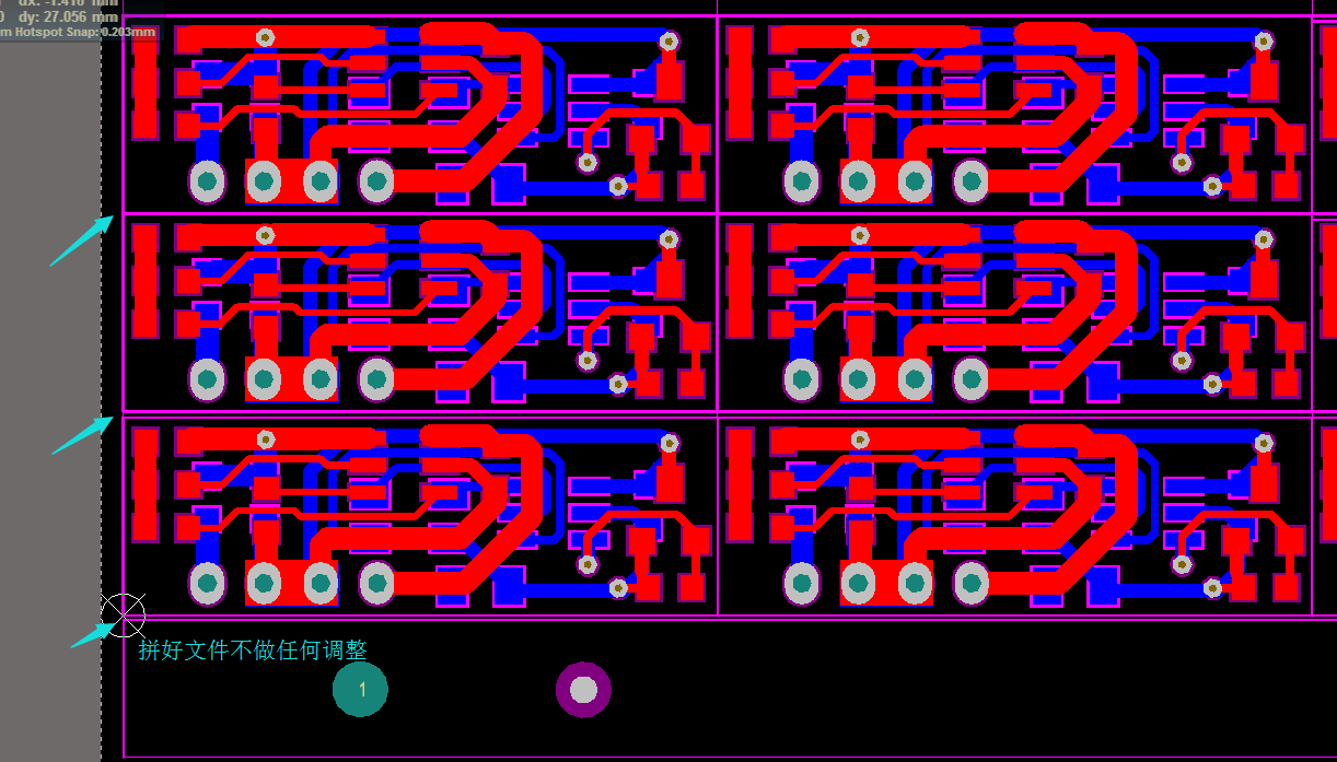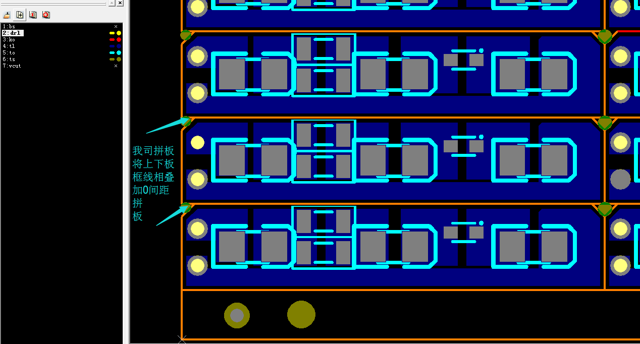 下圖是客戶拼好的文件,間距不統(tǒng)一也不做任何調(diào)整,因?yàn)槟谙翽CB文件的同時(shí),可能同時(shí)去下鋼網(wǎng)文件,如做了調(diào)整鋼網(wǎng)文件將對不上。