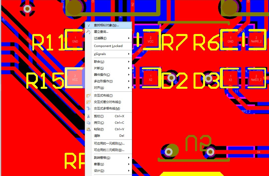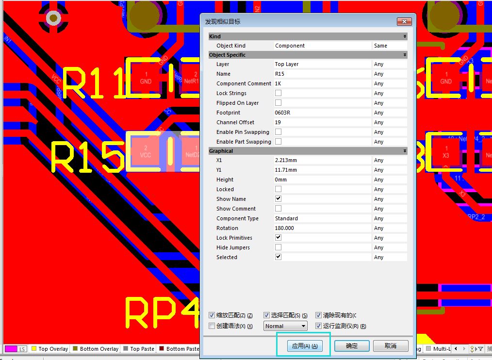 首先點(diǎn)中一個器件,右鍵找到查找相似對象然后直接應(yīng)用,不要改任何設(shè)置。器件就都會選中,然后確定,去掉勾選Show Name字符就消失了,大家可以試試!