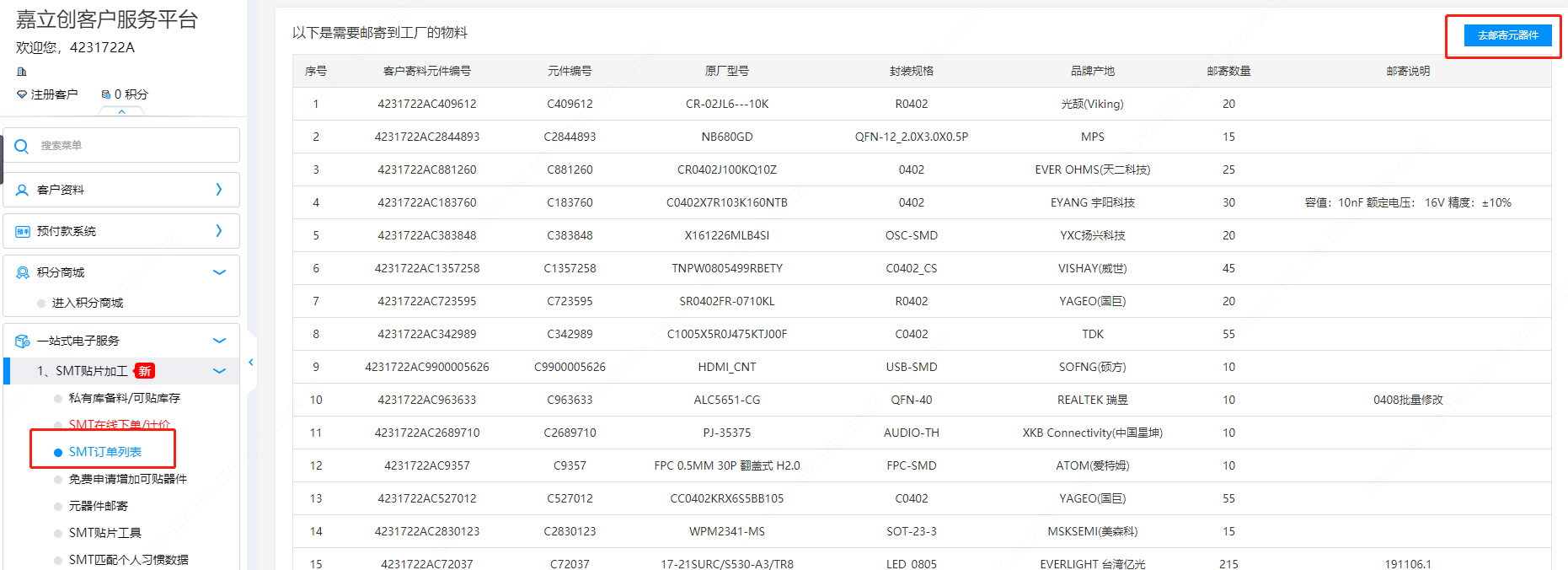 第八步:如圖所示在貼片加工菜單下點開【SMT訂單列表】菜單,在屏幕上方可以看需要郵寄的器件清單,點【去郵寄元器件】的按鈕即可。