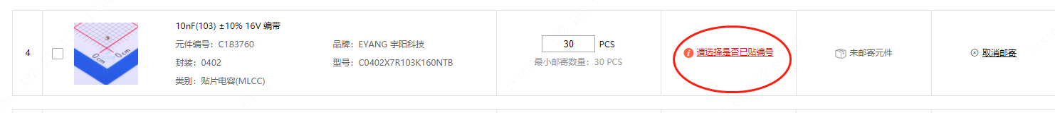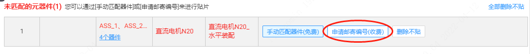 第一步:在下SMT訂單選器件界面,未匹配到型號的器件,可以直接郵寄,可以點【申請郵寄編號(收費)】