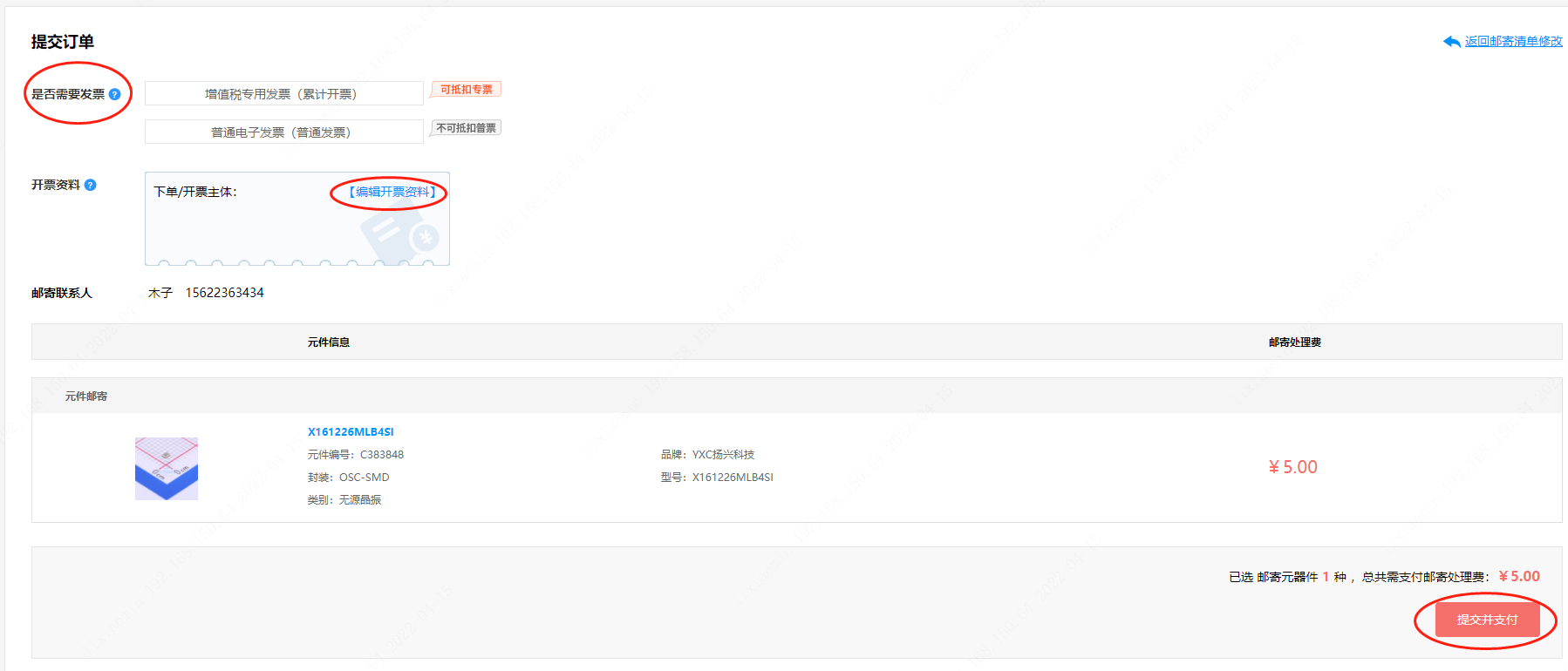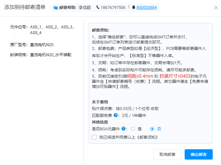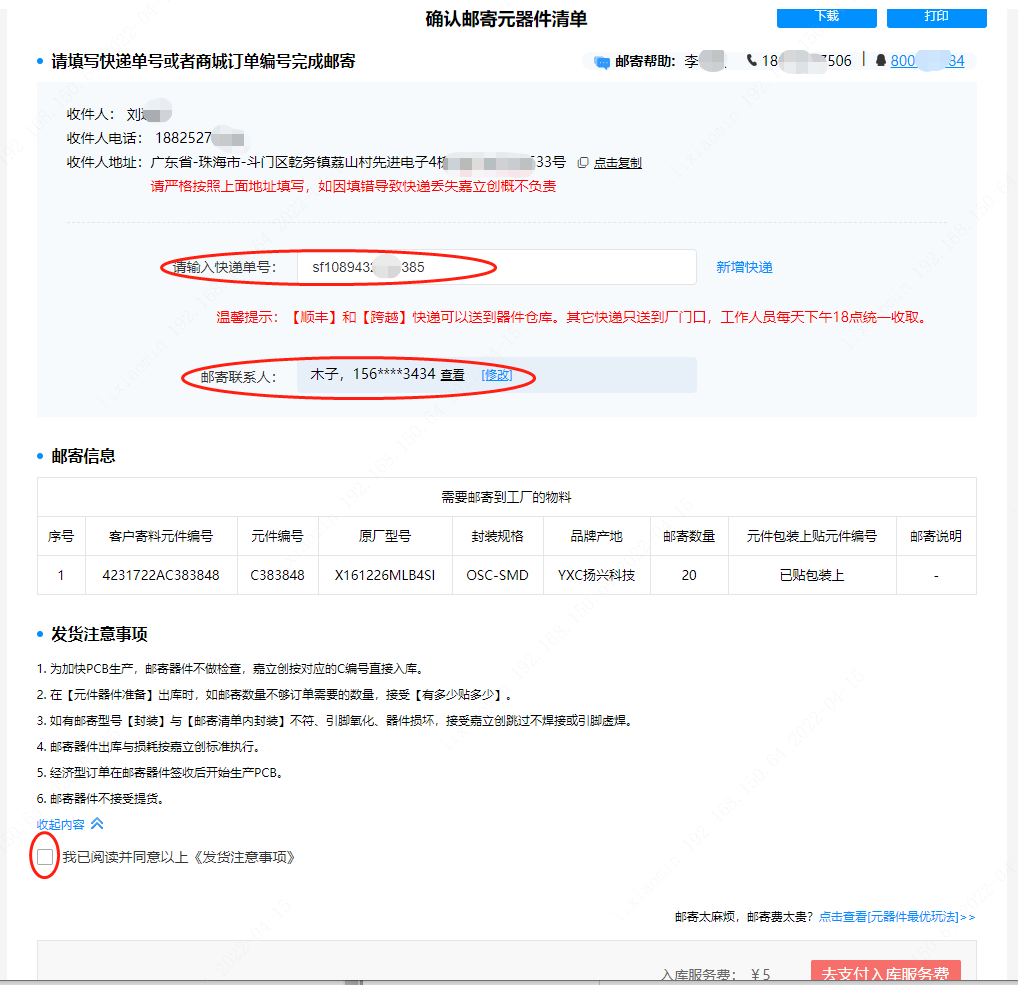 第十步:點完后會彈出確認郵寄元器件清單頁面,這個頁面需要您下好快遞(記得在每個需要郵寄的器件包裝袋上寫好器件編號),下好后回來填好【快遞單號】、【郵寄聯(lián)系人】,閱讀并勾選發(fā)貨注意事項。