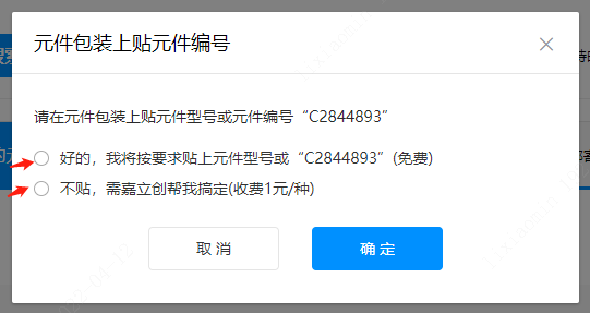 (1)點【請選擇是否已貼編號】會出現(xiàn)選擇彈窗,在元件包裝上勾選由客戶自己貼或嘉立創(chuàng)貼元件編號,并補充元器件的基本封裝信息。