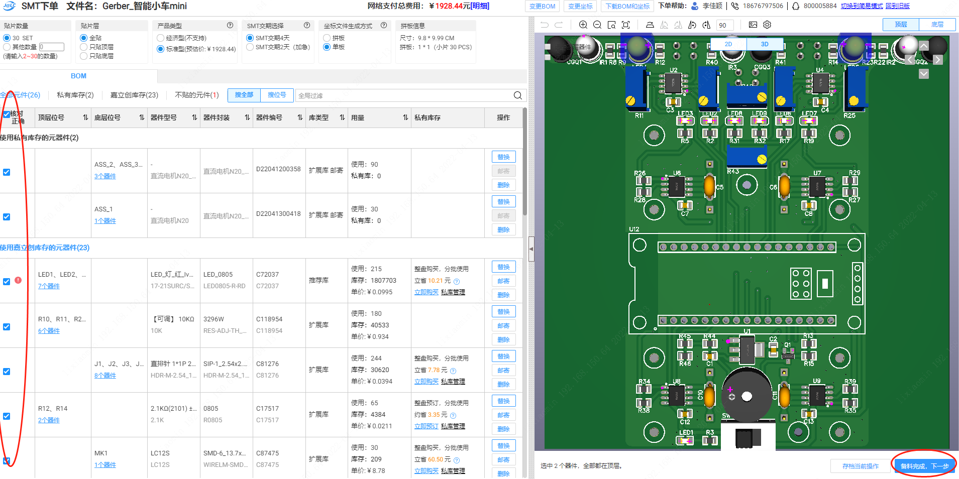第四步:確定好需要郵寄的器件型號,勾選【核對正確】,要確保所有都勾上,匹配完成后,然后點【備料完成,下一步】