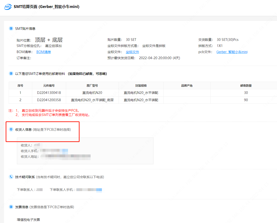 第六步:選擇處理方式后,會彈出SMT結(jié)算頁面。核對好【收貨人信息】等信息
