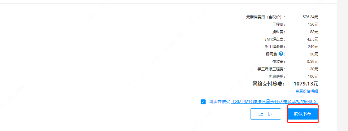 第七步:核對好后,點【確認下單】,點完后系統(tǒng)會自動跳回主頁,這樣需要郵寄的器件才算真正加入到【待郵寄】清單里,未下單的話,需要郵寄的器件不會顯示出來。(若您屬于標(biāo)準(zhǔn)型號的訂單,將不再等郵寄器件入庫。PCB資料與SMT工程資料做好后,即可安排生產(chǎn)。)