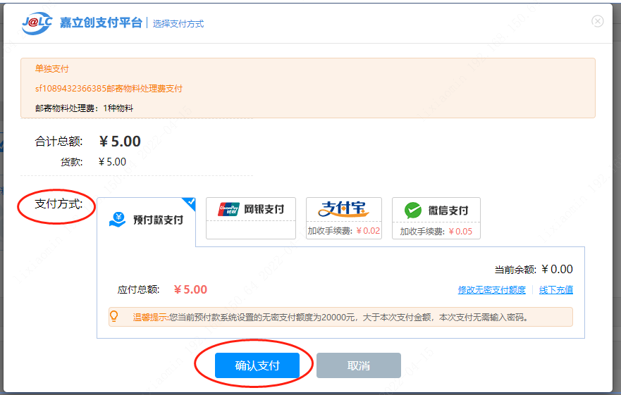 第十二步,選擇支付方式付款后,點擊【確認支付】就完成了郵寄器件訂單。