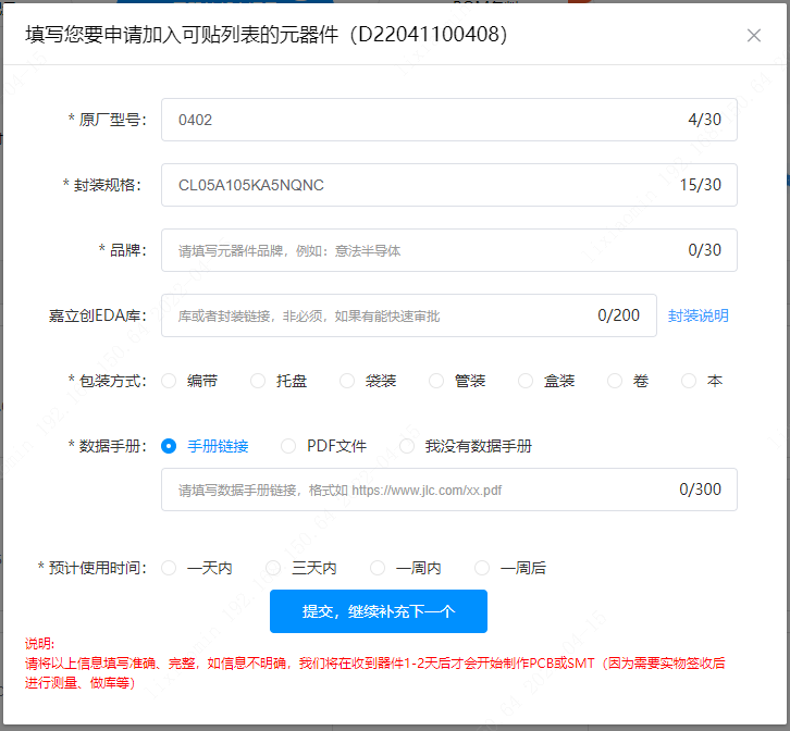 點擊【待補全元件信息】,會彈出“填寫您要申請加入可貼列表的元器件”的頁面,需要客戶提供元器件型號的尺寸信息。
