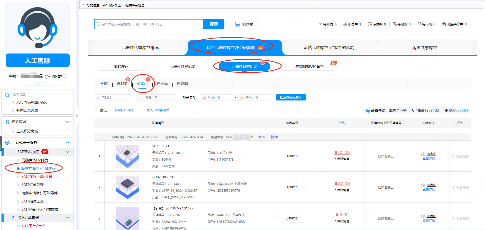 在【私有庫備料/可貼庫存】的菜單中,點“我有元器件庫存/BOM備料”字樣,再點擊【元件郵寄記錄】,可以看到郵寄的各種狀態(tài)。在【郵寄中】的狀態(tài)可以“修改”或者“新增”快遞號信息。