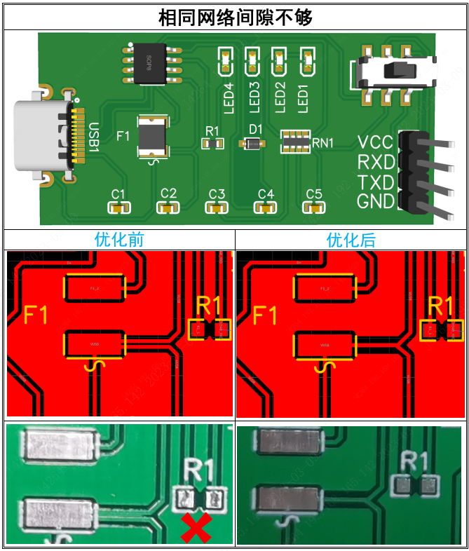 我司采用干膜工藝生產,為避免干膜碎對PCB造成開短路的不良,對于相同網絡的間隙要求0.254mm(相關說明詳見下單前技術員必看)