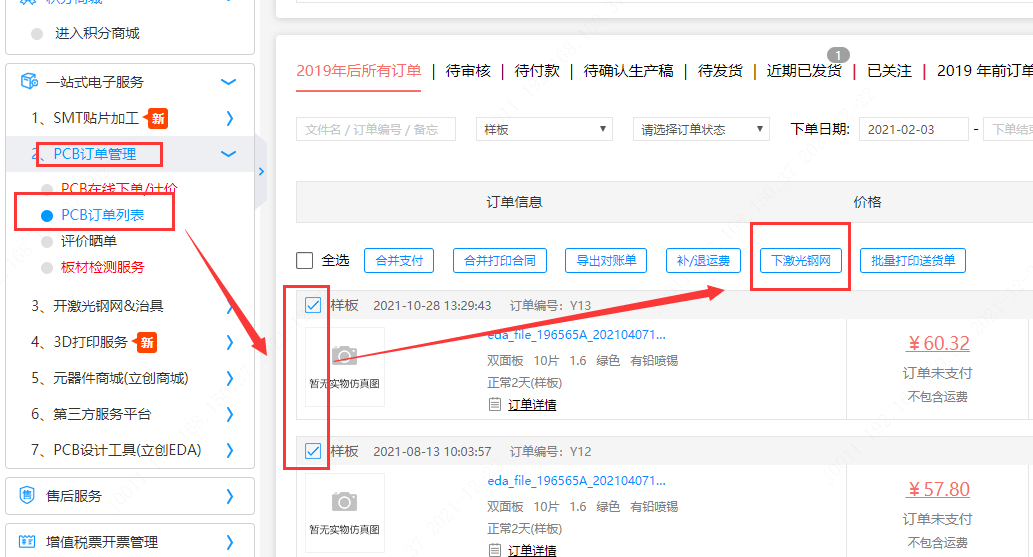 2).若PCB是在嘉立創(chuàng)做的,同類型訂單請在訂單確認里面選擇PCB訂單下鋼網(wǎng)(如圖)