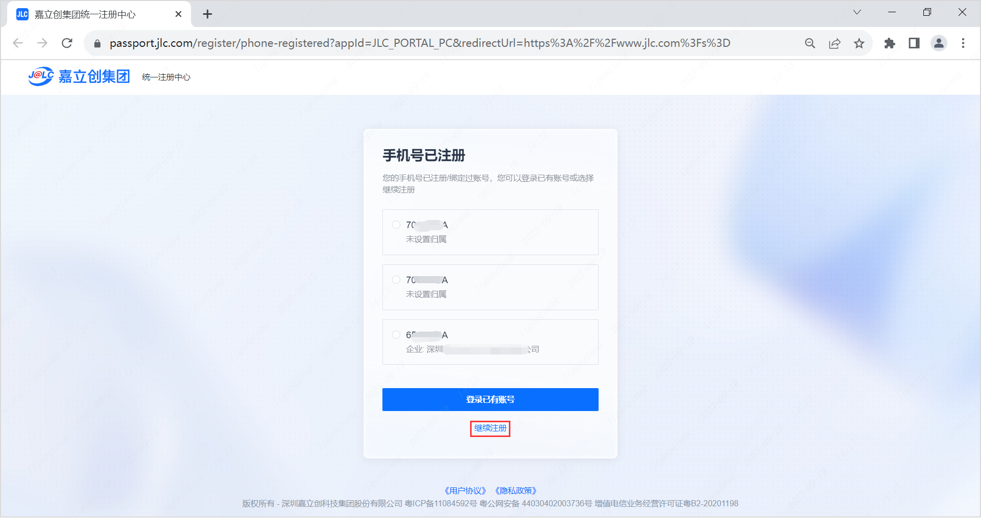 如果您的手機(jī)號已注冊申請過賬號,會將已注冊的賬號羅列顯示,此時(shí)可以點(diǎn)擊 “ 繼續(xù)注冊 ” 按鈕,進(jìn)行新賬號申請;若您的手機(jī)號未注冊過賬號,則會直接提示注冊成功。