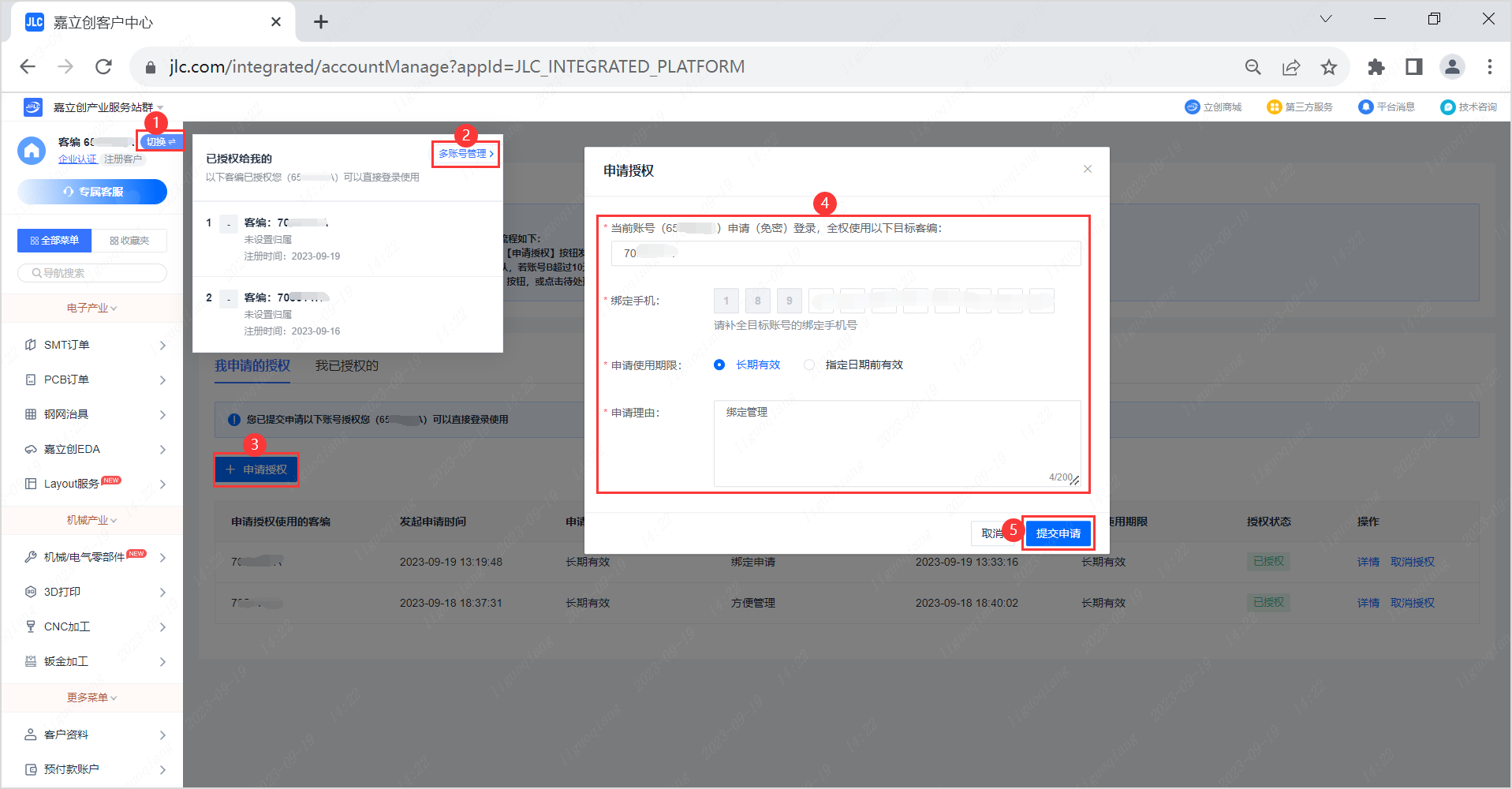 (2)在 “ 多賬號管理 ” 頁面,點(diǎn)擊 “ 申請授權(quán) ”,填充要綁定的申請賬號,完善手機(jī)號碼信息,確定使用期限,補(bǔ)充申請理由,最后提交申請,等待審核。