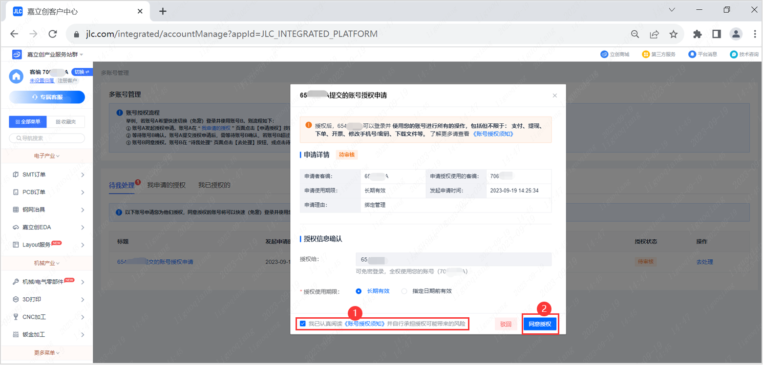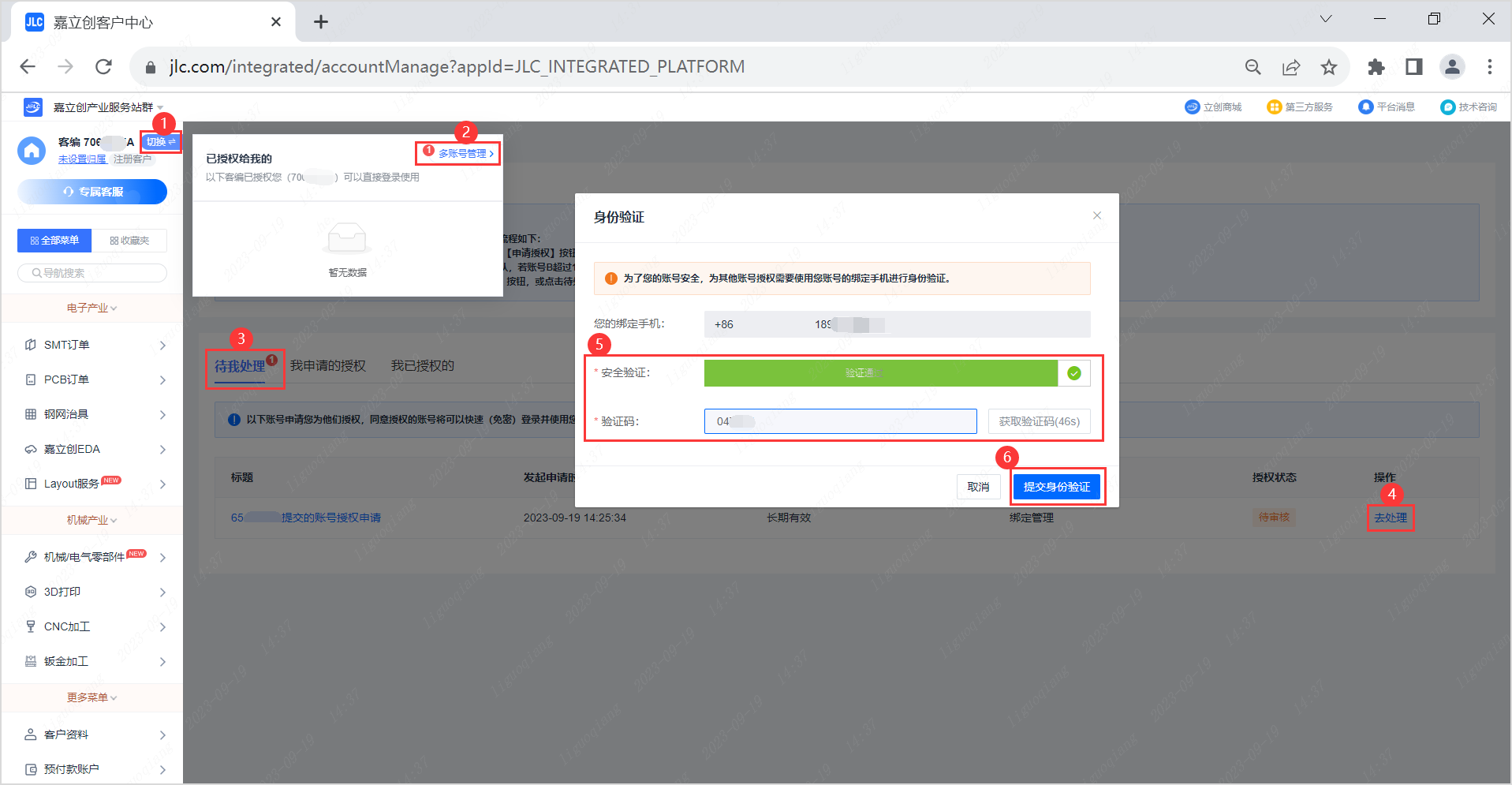 登錄被申請授權(quán)的賬號,進(jìn)入“ 多賬號管理 ” 頁面,在 “ 待我處理 ” 中查看授權(quán)申請,點(diǎn)擊 “ 去處理 ”,進(jìn)行身份驗(yàn)證,核對申請信息,進(jìn)行審核處理。