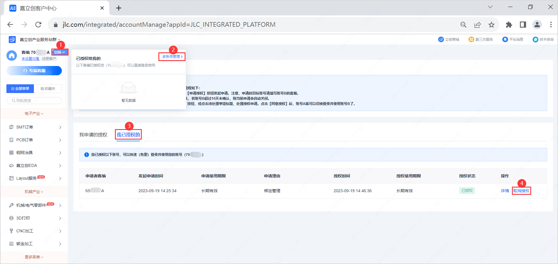 進(jìn)入 “ 多賬號管理 ” 頁面,在 “ 我已授權(quán)的 ” 一欄,可點(diǎn)擊 “ 取消授權(quán) ” ,即可對已授權(quán)的賬號,實(shí)現(xiàn)授權(quán)收回。