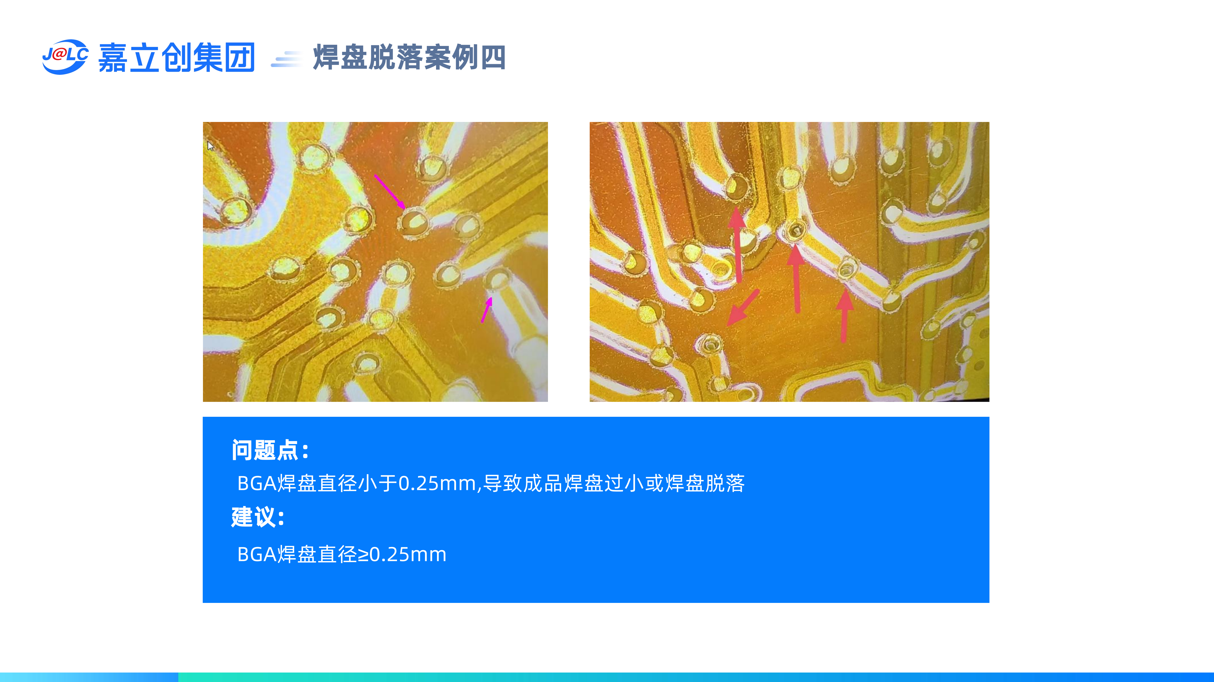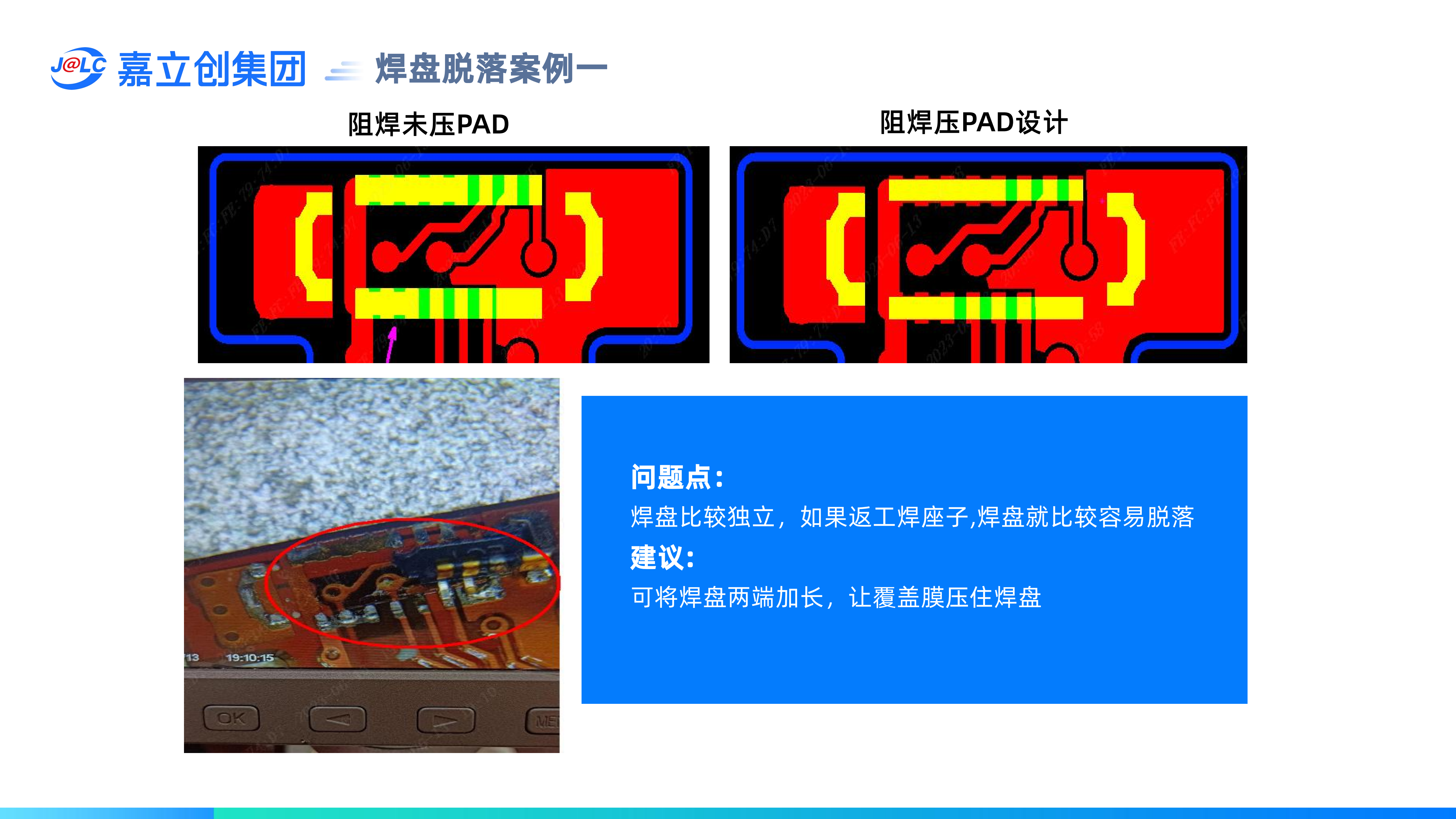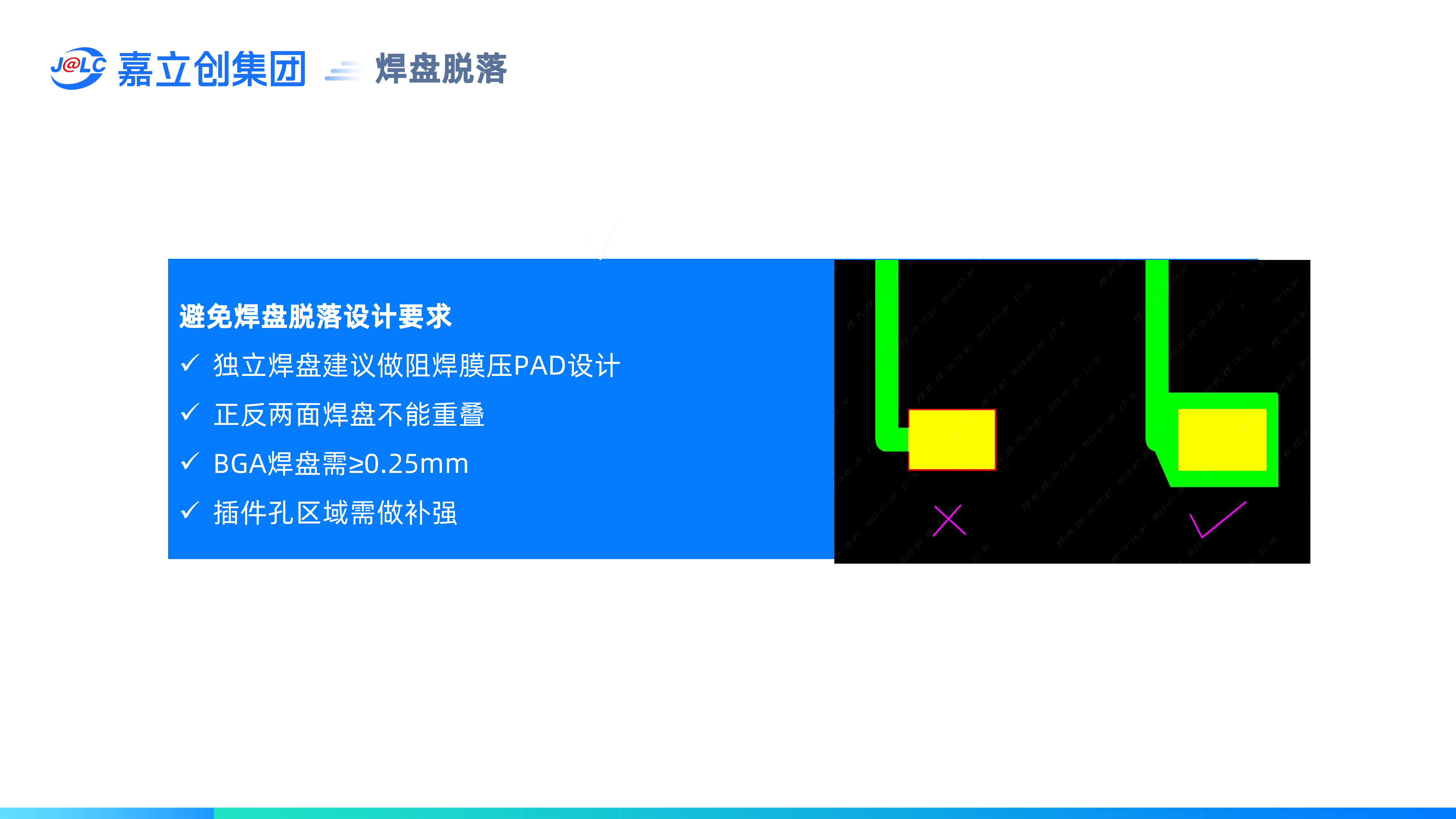 避免焊盤脫落設(shè)計要求:(1)獨立焊盤建議做阻焊膜壓PAD設(shè)計;(2) 正反兩面焊盤不能重疊;(3) BGA焊盤需≥0.25mm;(4) 插件孔區(qū)域需做補強