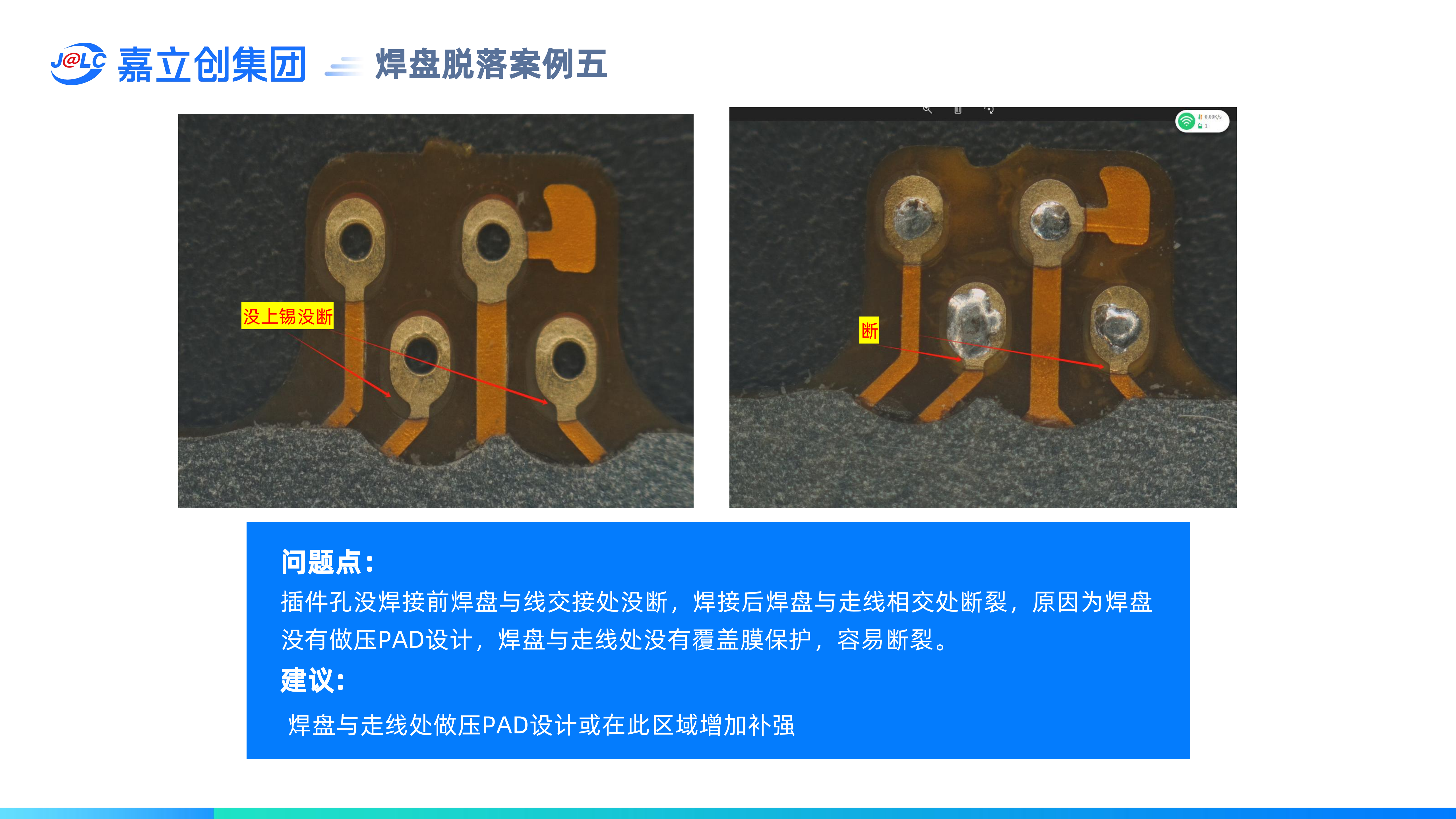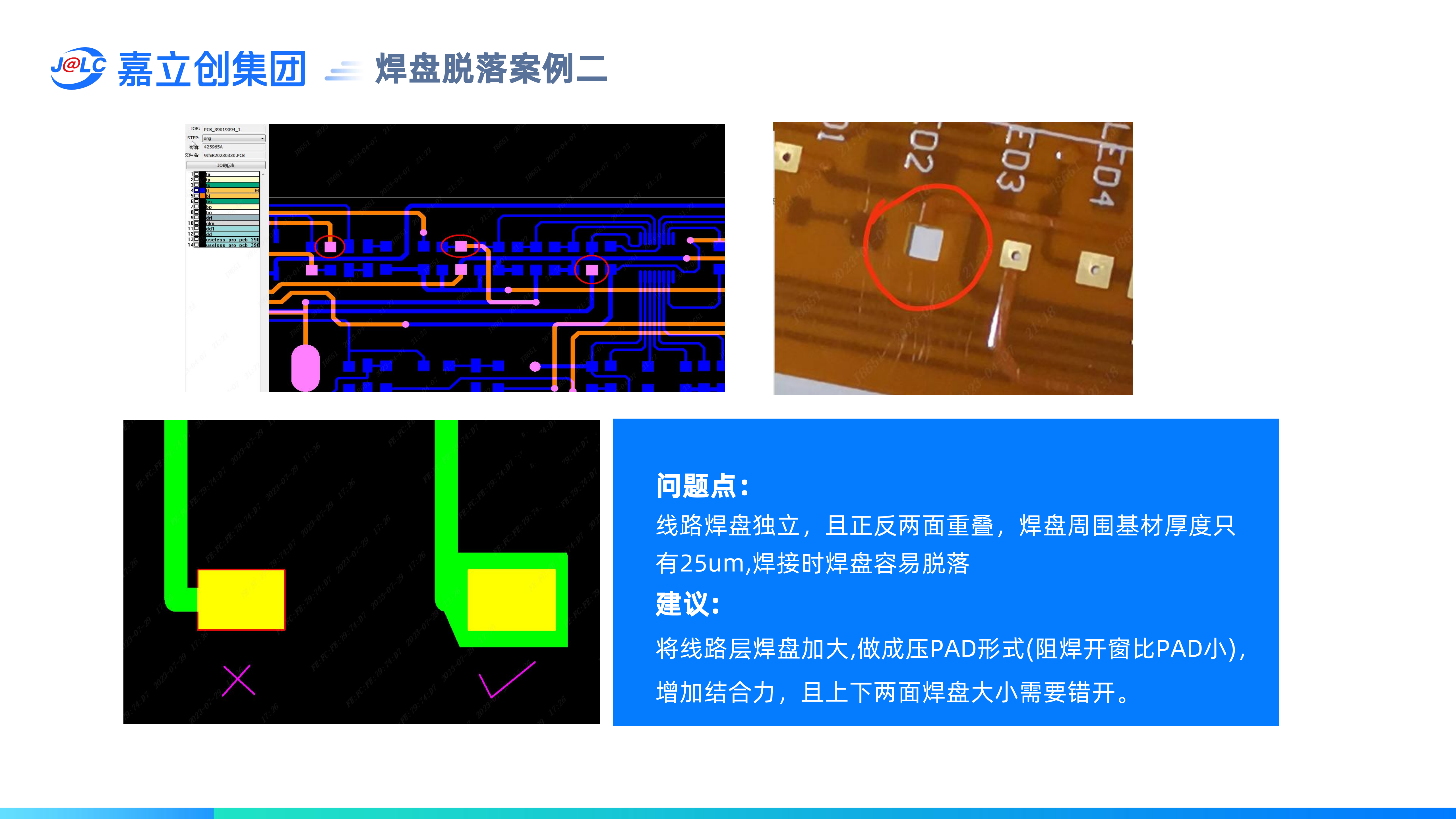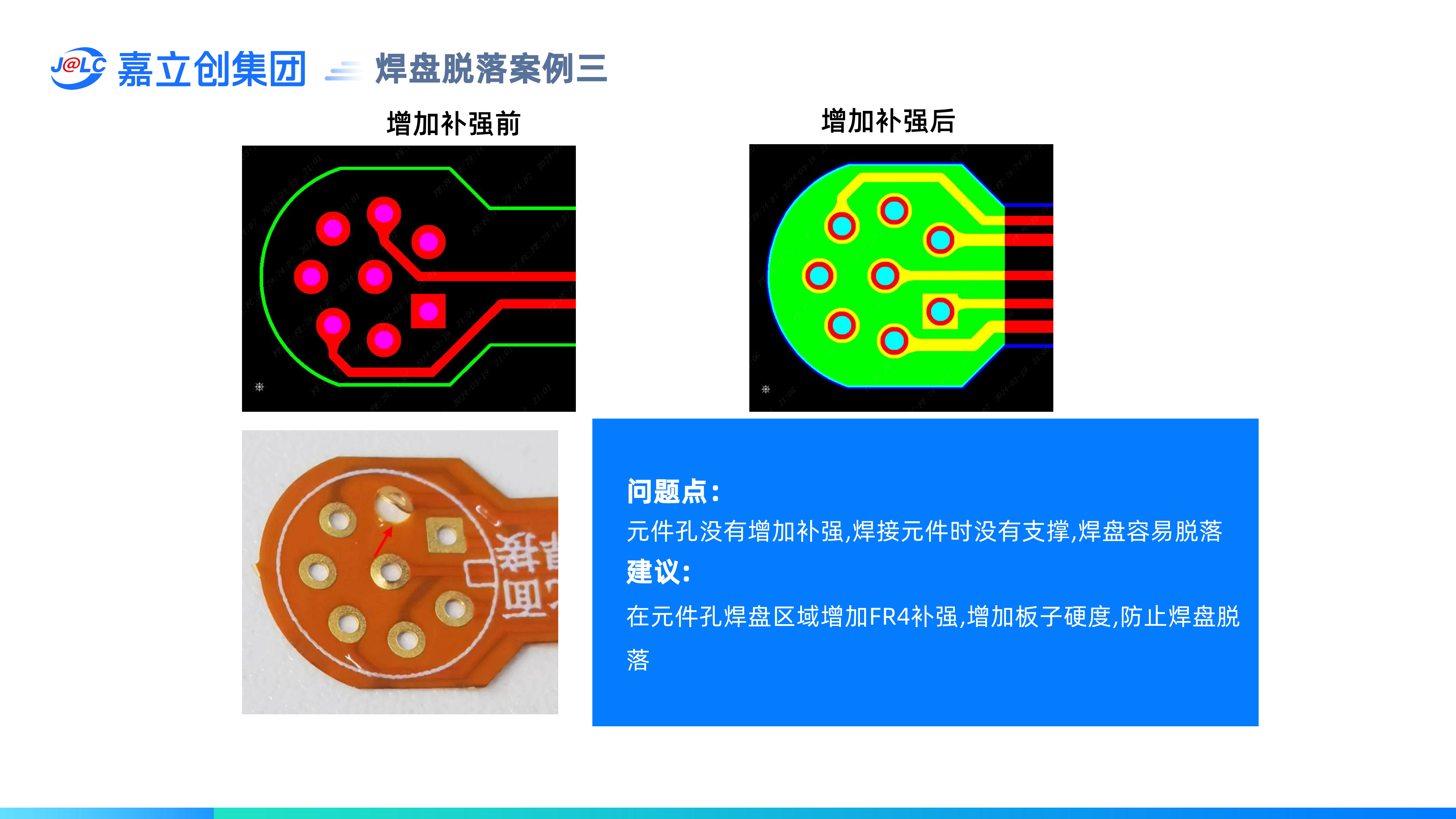 避免焊盤脫落設(shè)計要求:(1)獨立焊盤建議做阻焊膜壓PAD設(shè)計;(2) 正反兩面焊盤不能重疊;(3) BGA焊盤需≥0.25mm;(4) 插件孔區(qū)域需做補強