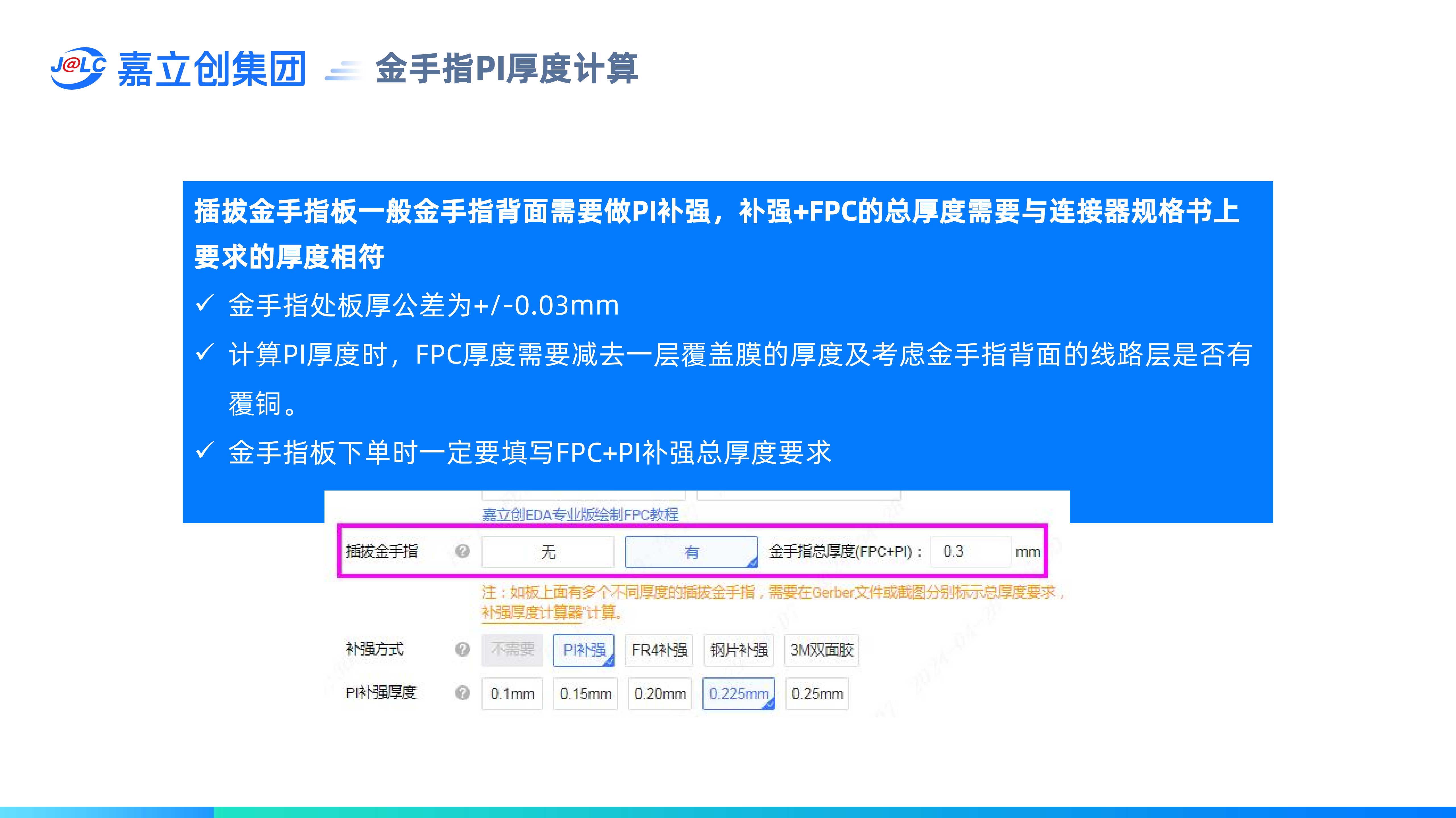 插拔金手指板一般金手指背面需要做PI補(bǔ)強(qiáng),補(bǔ)強(qiáng)+FPC的總厚度需要與連接器規(guī)格書上要求的厚度相符,金手指厚度計算工具:http://16938.com.cn/newOrder/#/calcGoldfingerPIThickness