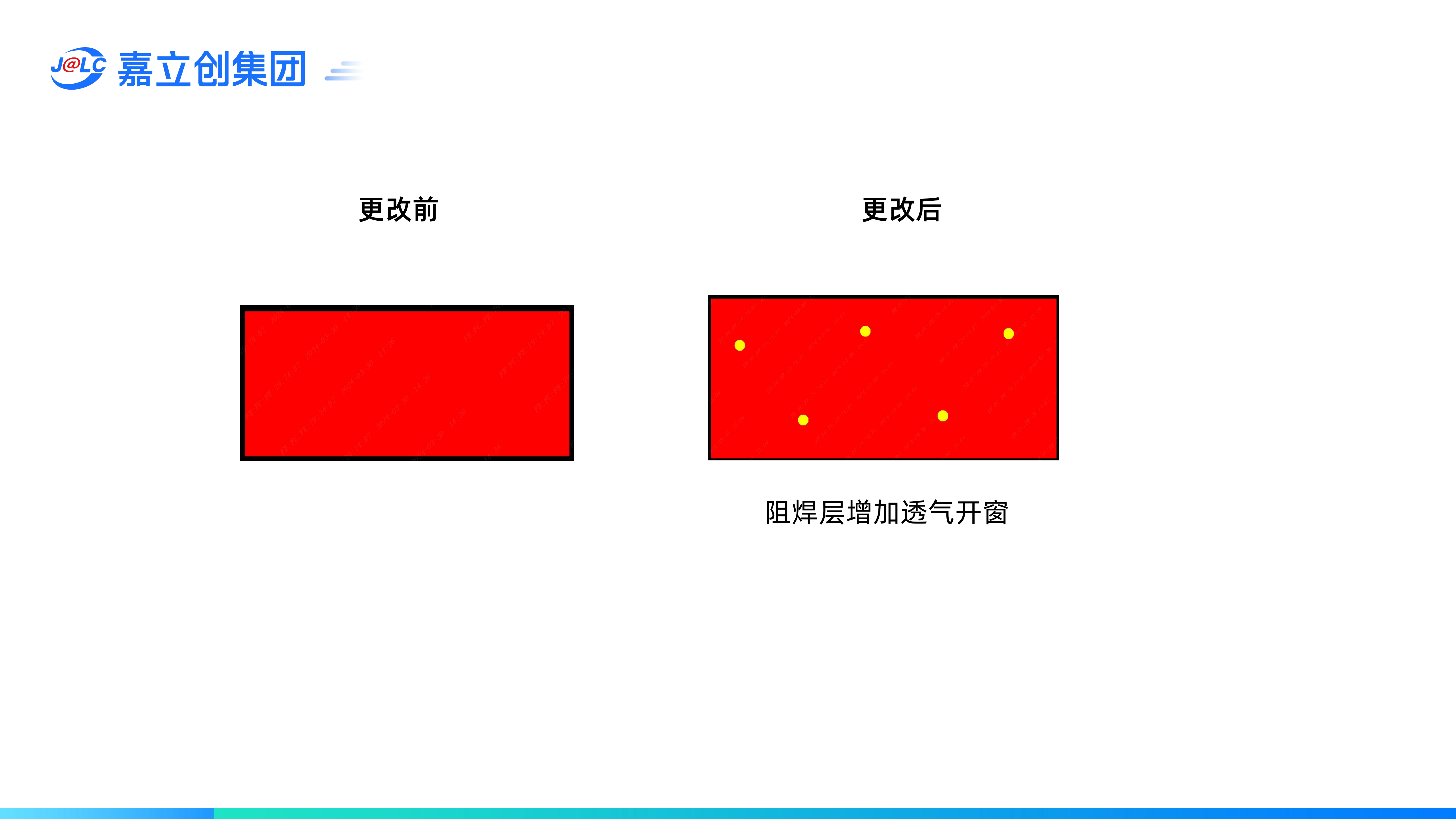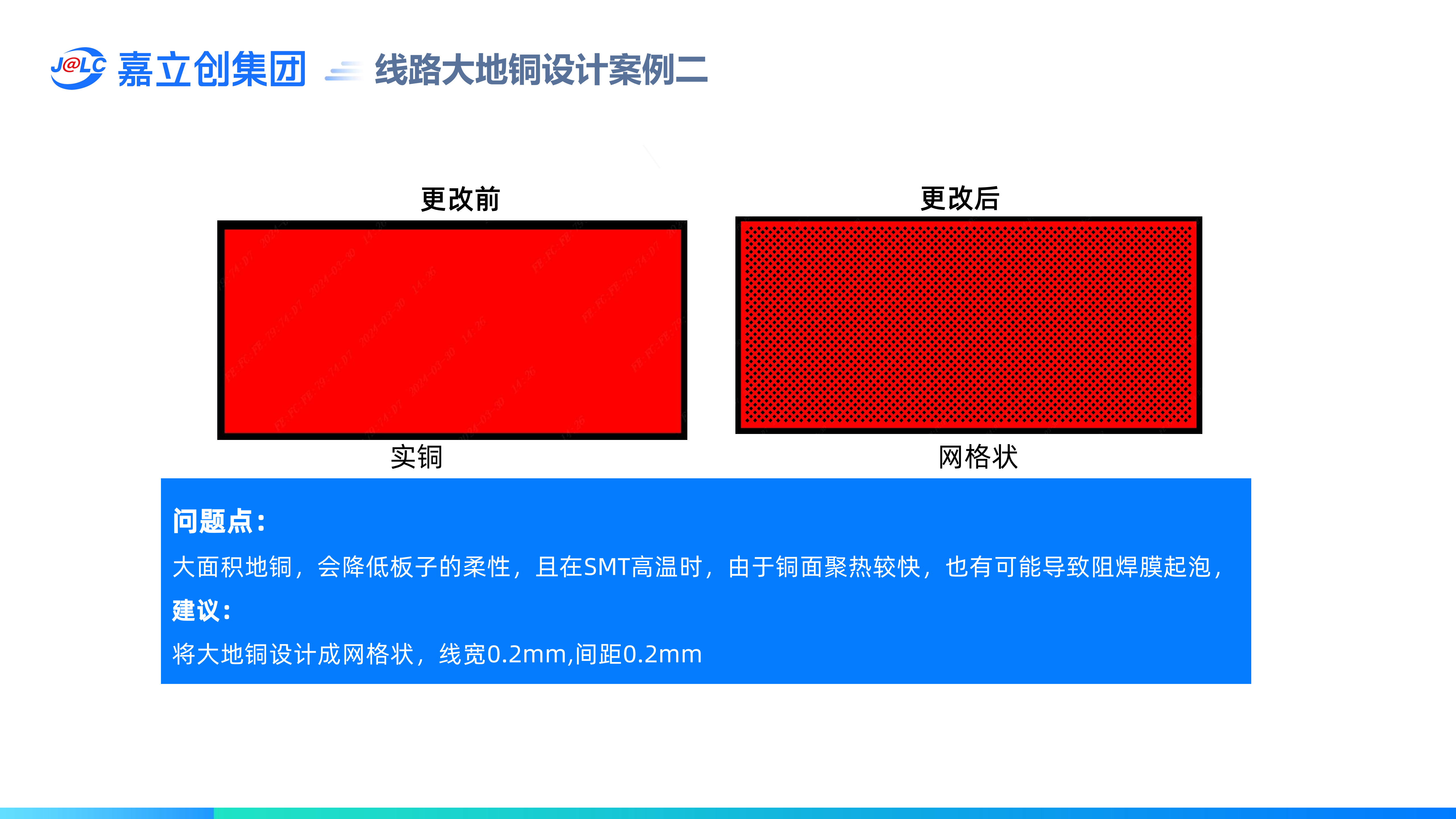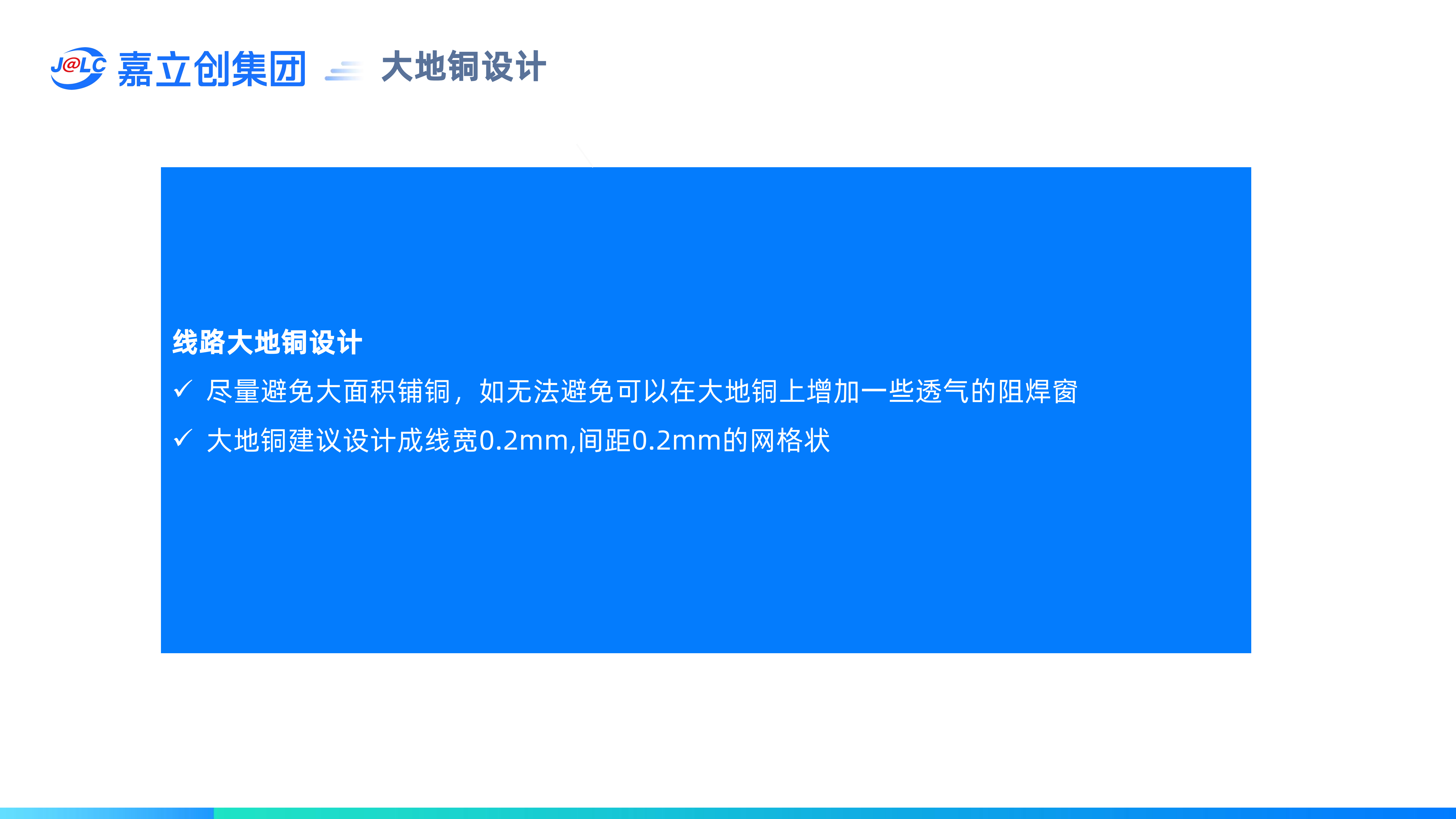 (1)盡量避免大面積鋪銅,如無法避免可以在大地銅上增加一些透氣的阻焊窗;(2)大地銅建議設(shè)計成線寬0.2mm,間距0.2mm的網(wǎng)格狀。