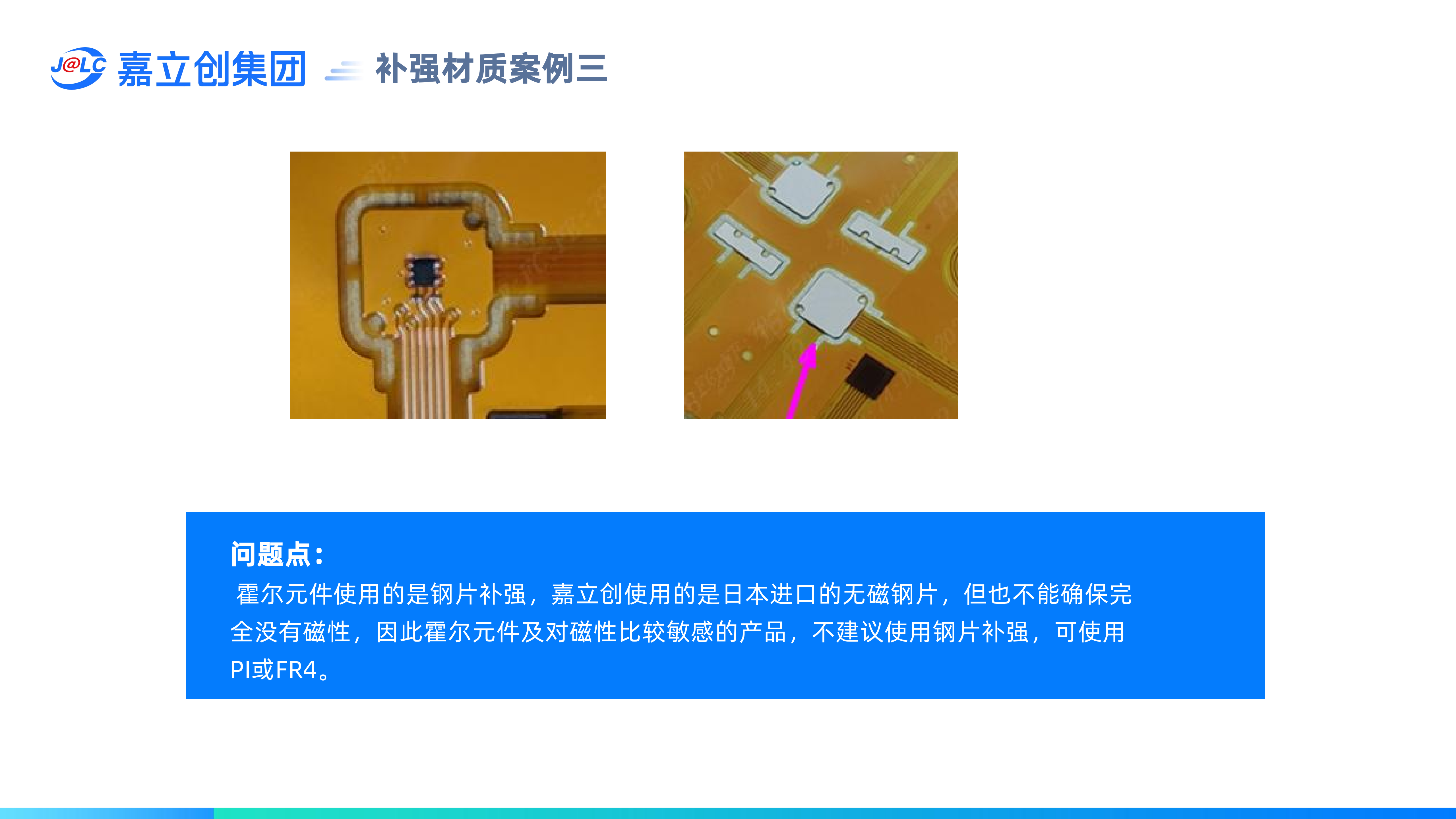 (1)PI補(bǔ)強(qiáng)適用于插拔類金手指區(qū)域補(bǔ)強(qiáng); (2)FR4適用插件孔區(qū)域補(bǔ)強(qiáng)或低端的IC芯片背面; (3)鋼片適用于IC芯片,BGA等器件背面補(bǔ)強(qiáng),平整度較好,但霍爾元件及插件孔不能使用。