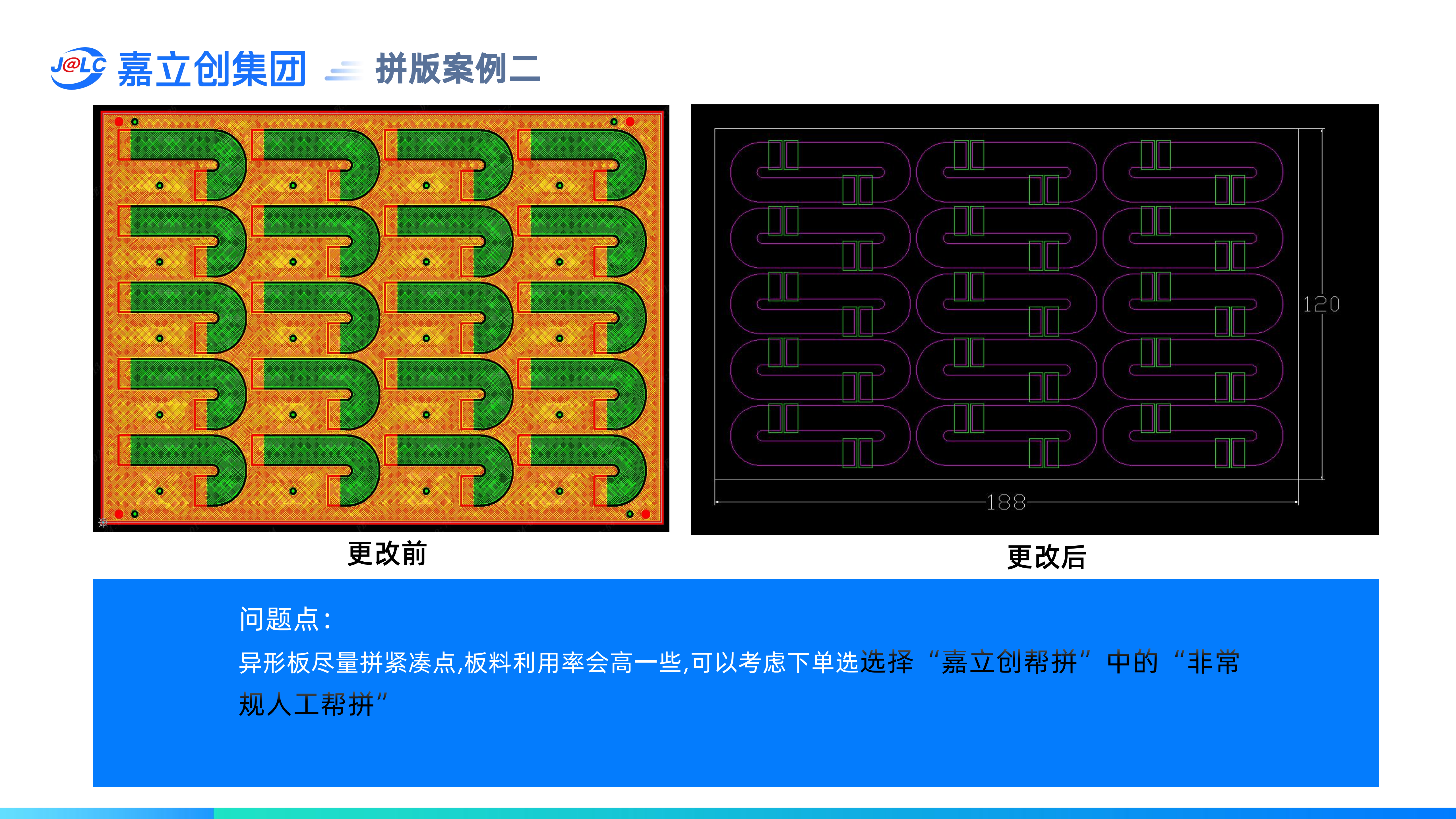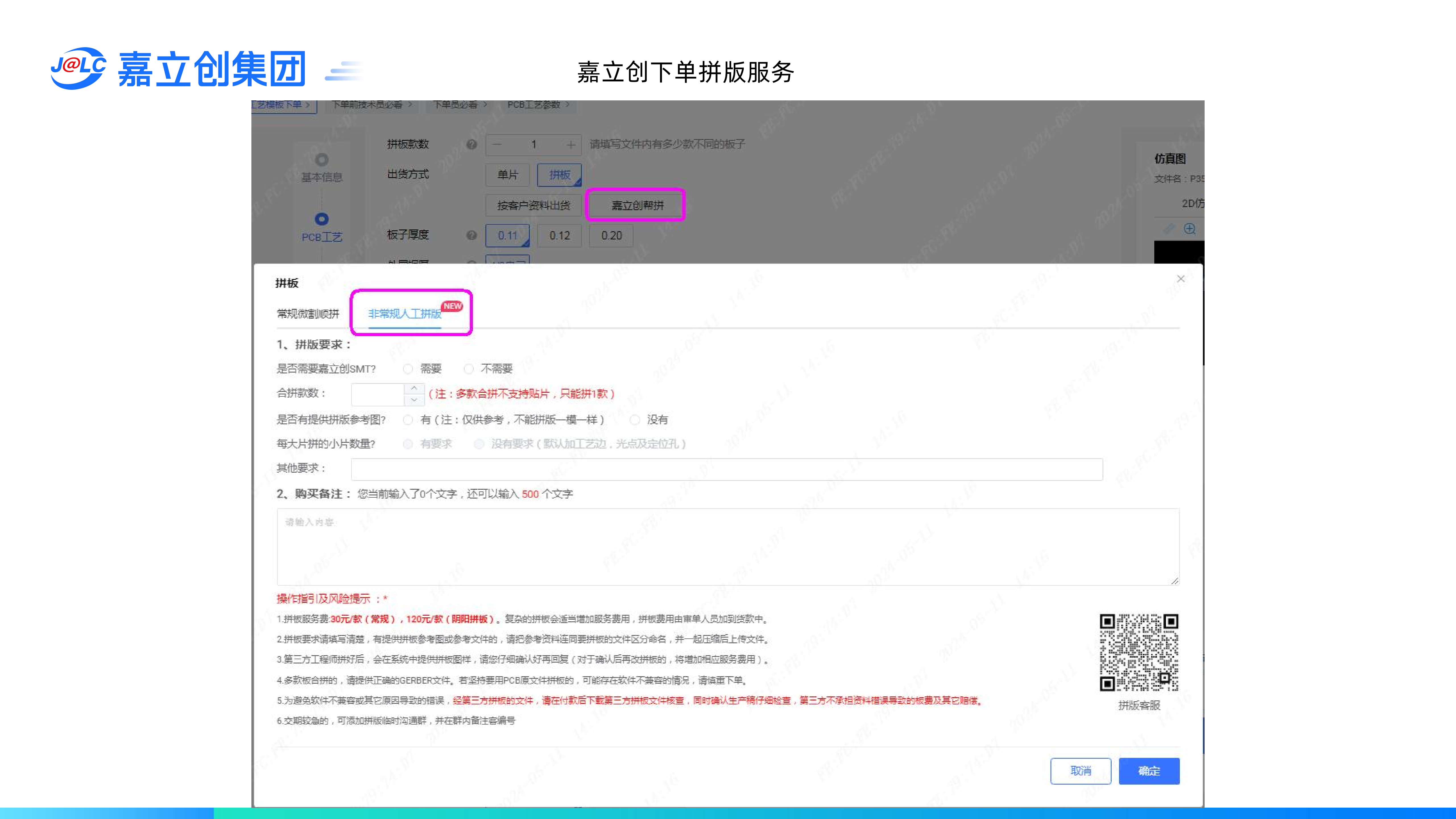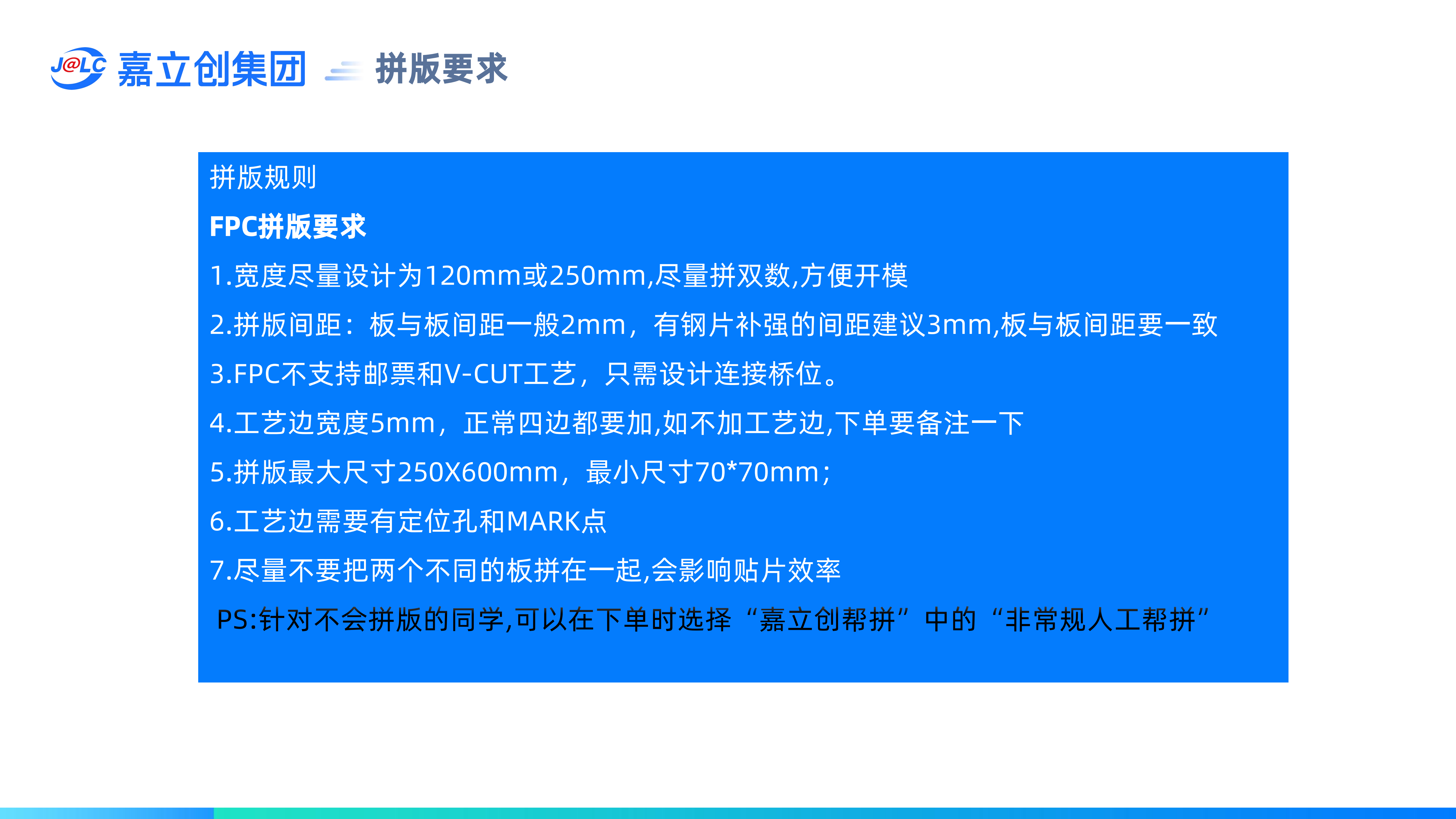 FPC拼版要求:針對不會拼版的同學(xué),可以在下單時(shí)選擇“嘉立創(chuàng)幫拼”中的“非常規(guī)人工幫拼”