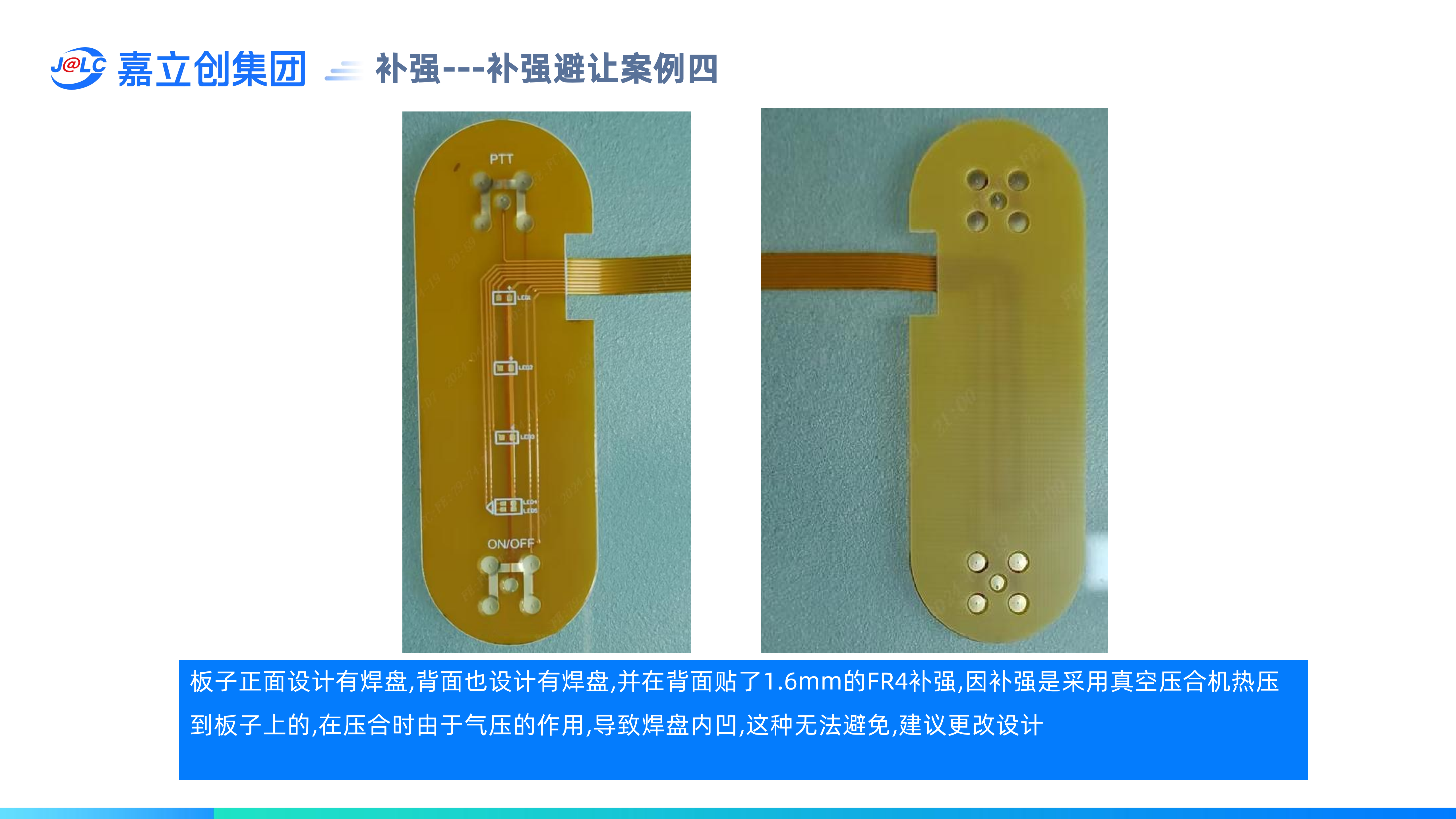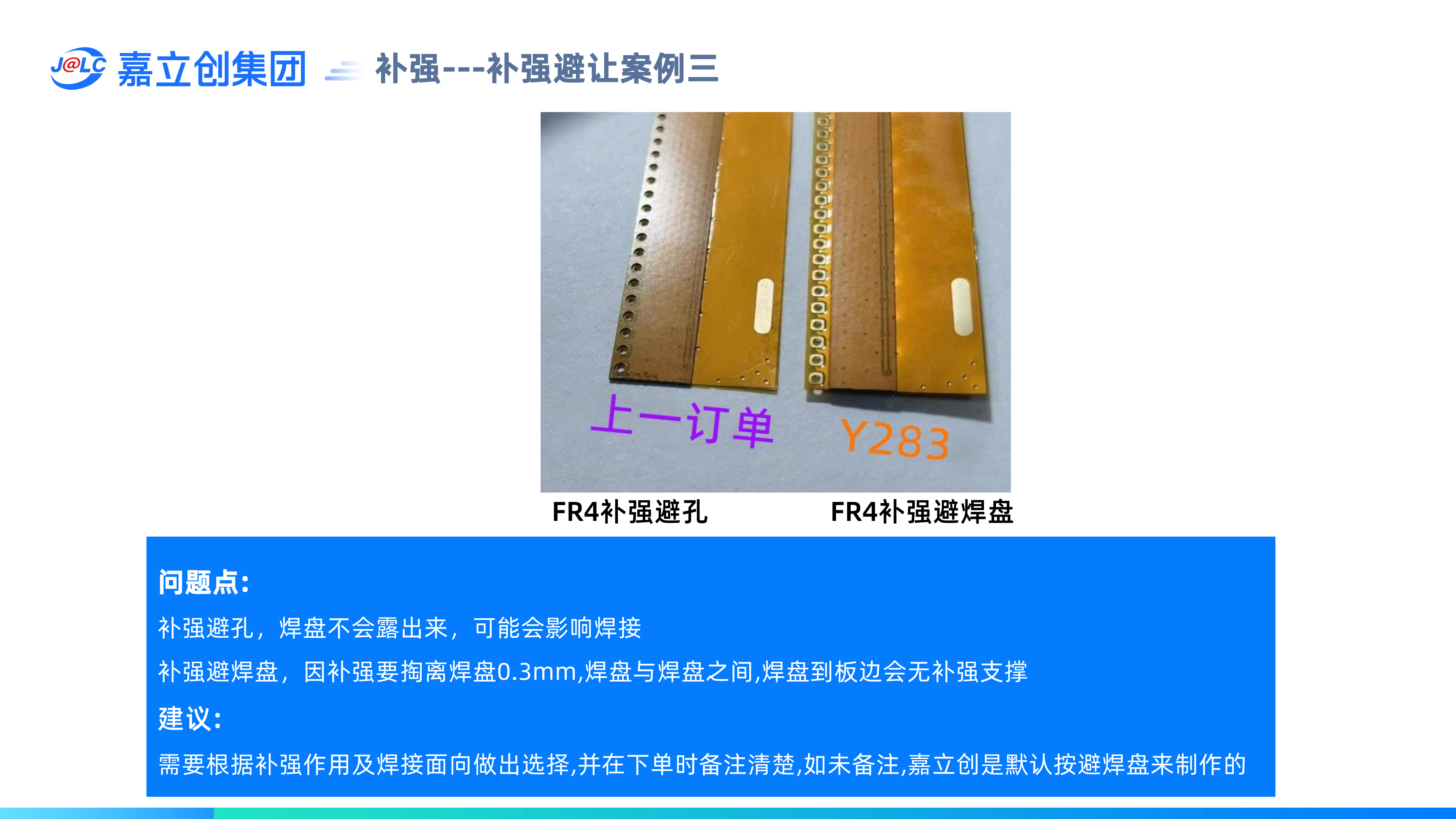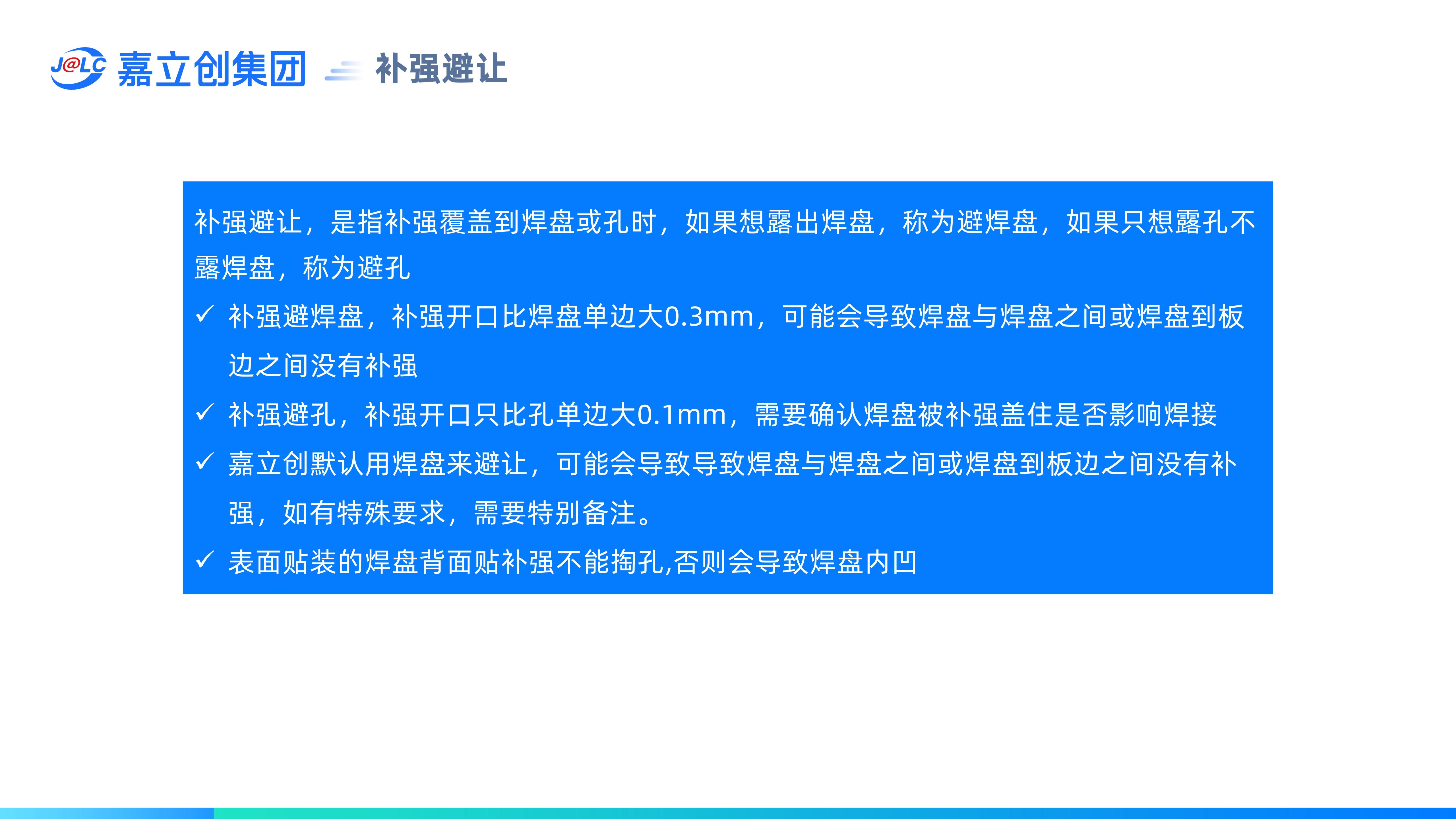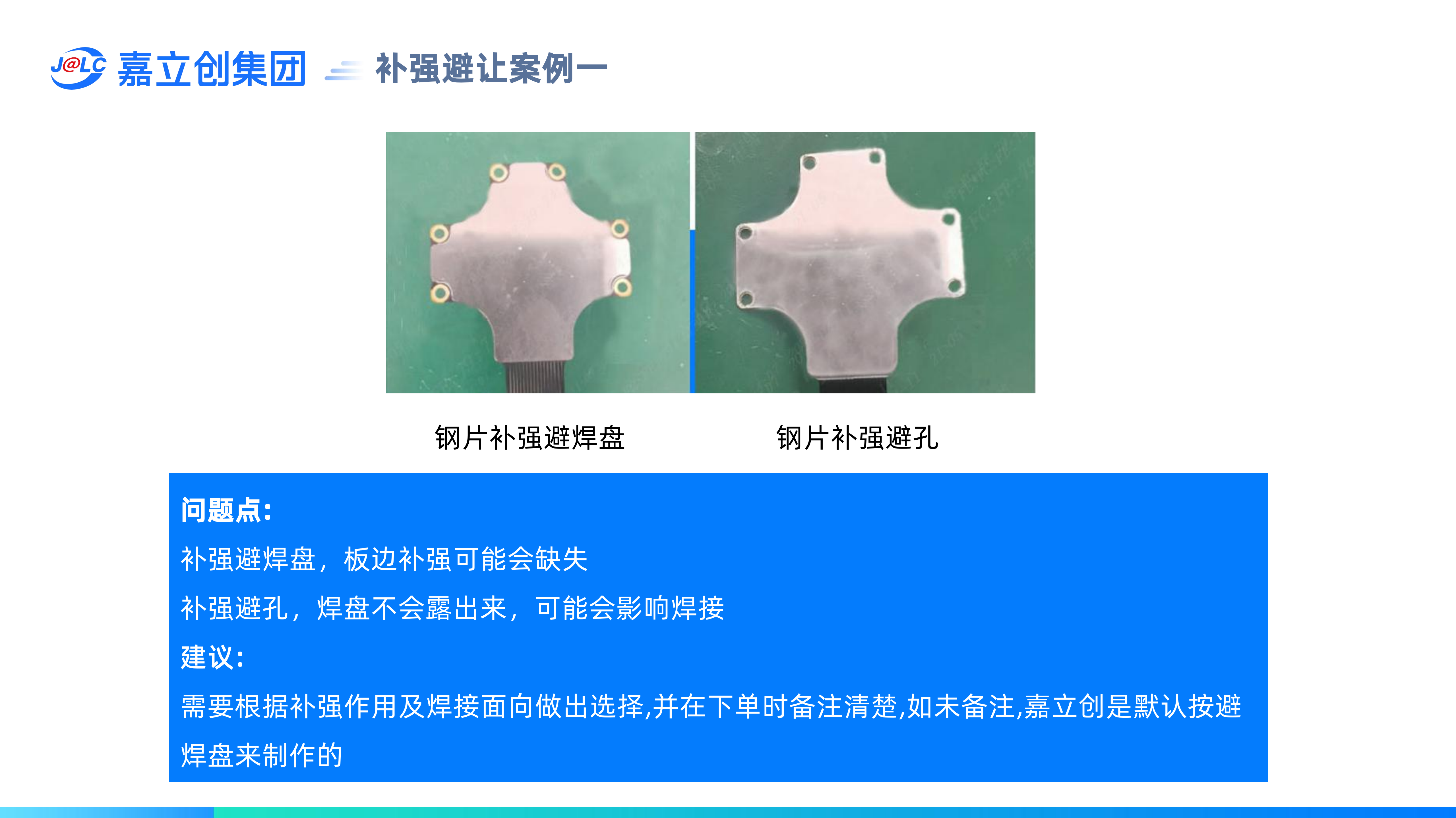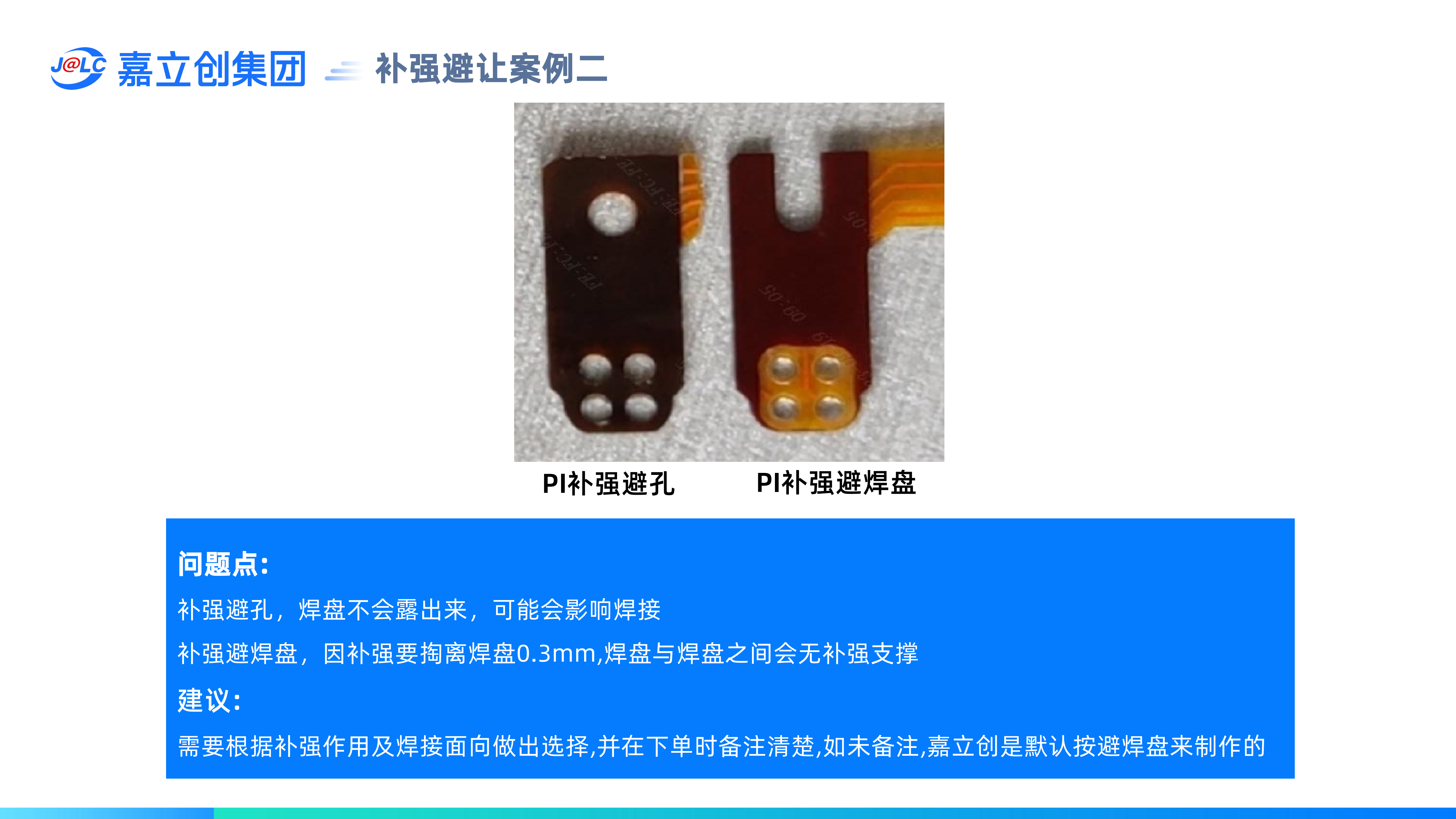 補(bǔ)強(qiáng)避讓,是指補(bǔ)強(qiáng)覆蓋到焊盤或孔時,如果想露出焊盤,稱為避焊盤,如果只想露孔不露焊盤,稱為避孔。(1)補(bǔ)強(qiáng)避焊盤,補(bǔ)強(qiáng)開口比焊盤單邊大0.3mm,可能會導(dǎo)致焊盤與焊盤之間或焊盤到板邊之間沒有補(bǔ)強(qiáng);(2)補(bǔ)強(qiáng)避讓,補(bǔ)強(qiáng)開口只比孔單邊大0.1mm,需要確認(rèn)焊盤被補(bǔ)強(qiáng)蓋住是否影響焊接;(3)嘉立創(chuàng)默認(rèn)用焊盤來避讓,可能會導(dǎo)致焊盤與焊盤之間或焊盤到板邊之間沒有補(bǔ)強(qiáng),如有特殊要求,需要特別備注;(4)表面貼裝的焊盤背面貼補(bǔ)強(qiáng)不能掏孔,否則會導(dǎo)致焊盤內(nèi)凹。