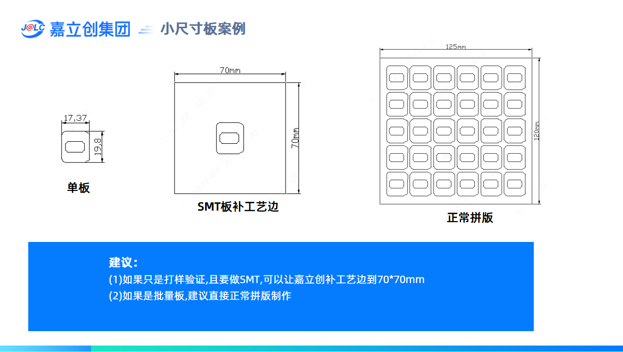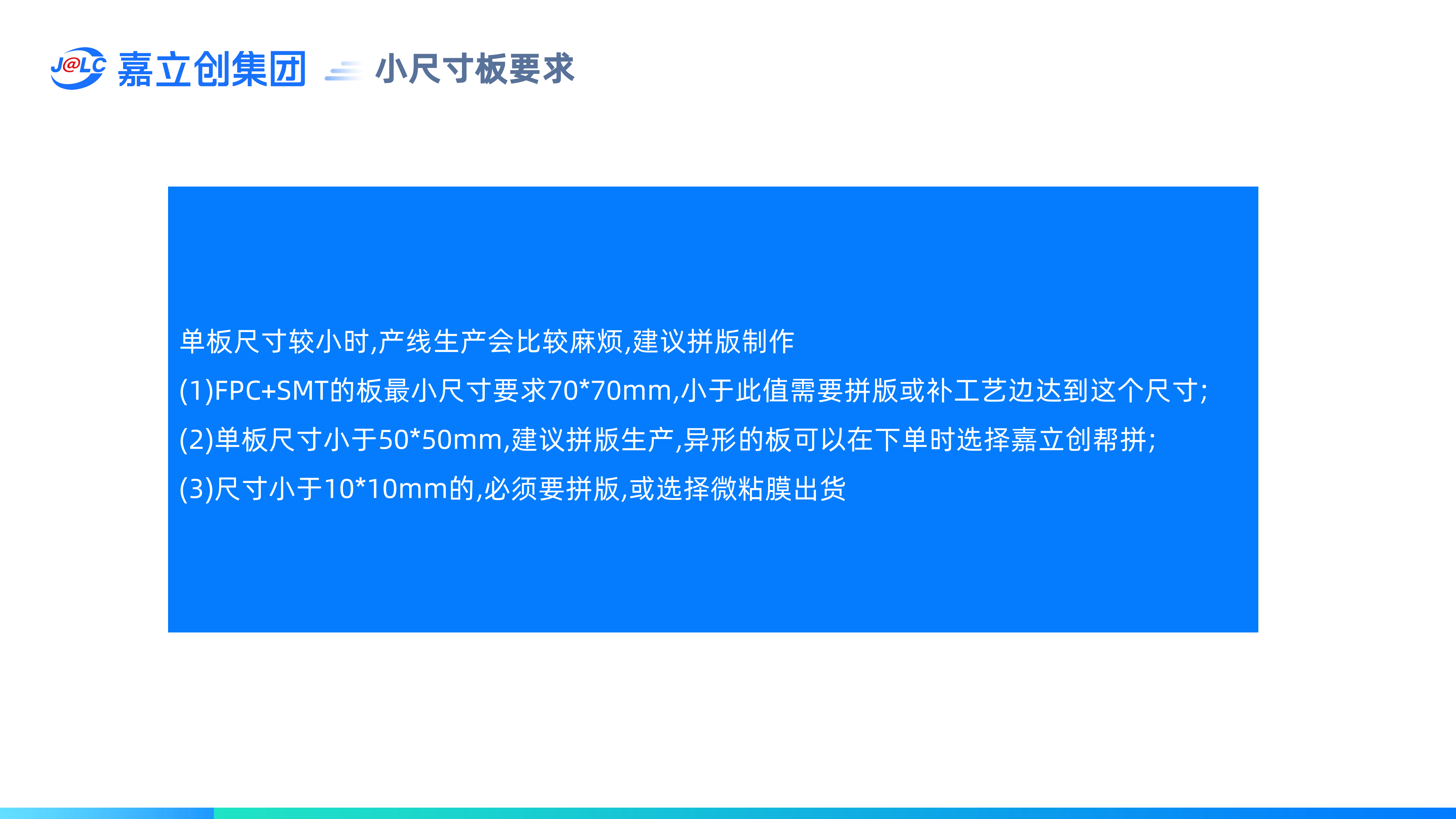 單板尺寸較小時,產(chǎn)線生產(chǎn)會比較麻煩,建議拼版制作。(1)FPC+SMT的板最小尺寸要求70*70mm,小于此值需要拼版或補(bǔ)工藝邊達(dá)到這個尺寸;(2)單板尺寸小于50*50,建議拼版生產(chǎn),異形的板可以在下單時選擇嘉立創(chuàng)幫拼(非常規(guī)拼版);(3)尺寸小于10*10mm的,必須要拼版,或選擇微粘膜出貨。